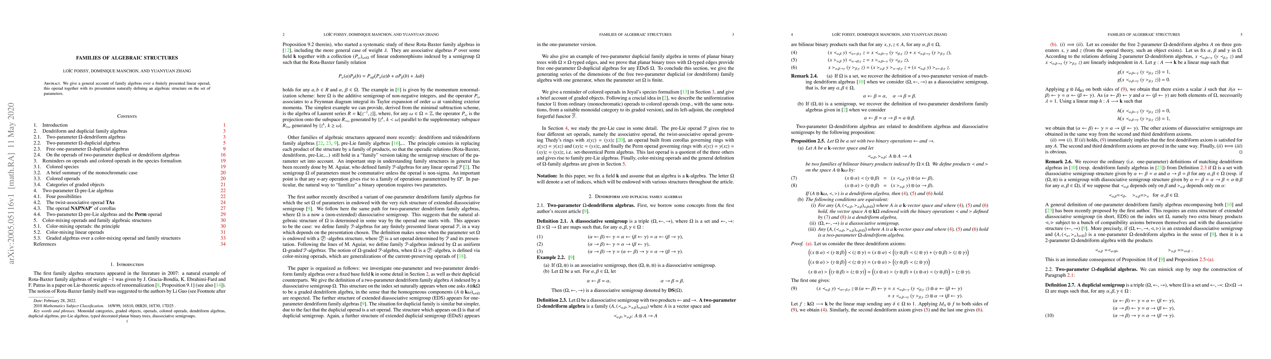 We give a general account of family algebras over a finitely presented linear operad, this operad together with its presentation naturally defining an algebraic structure on the set of parameters.