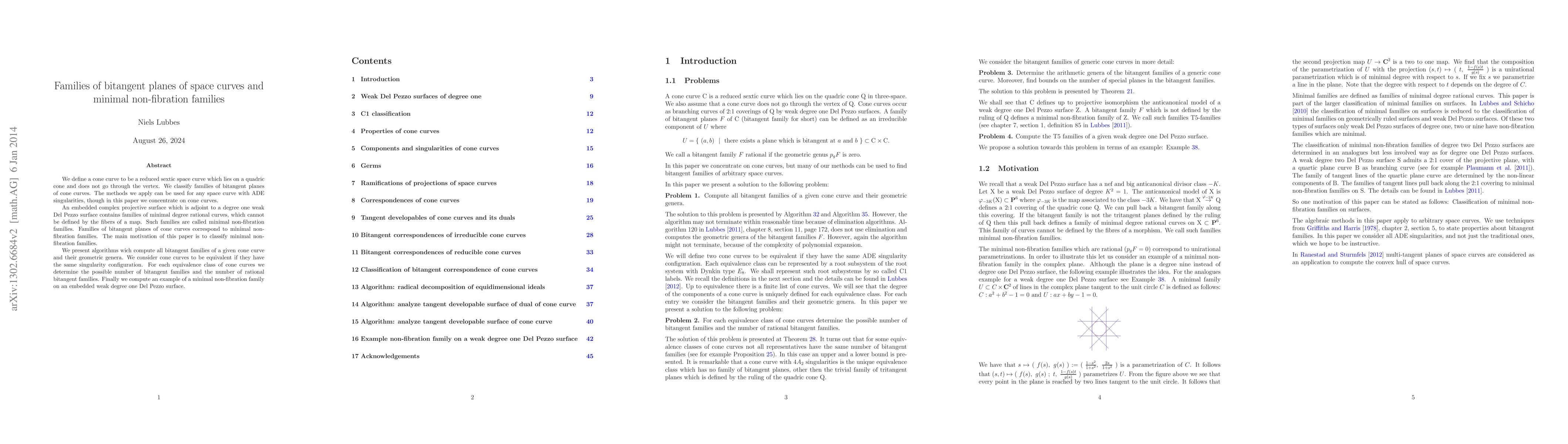 We define a cone curve to be a reduced sextic space curve which lies on a quadric cone and does not go through the vertex. We classify families of bitangent planes of cone curves. The methods we apply can be used for any space curve with ADE singularities, though in this paper we concentrate on cone curves. An embedded complex projective surface which is adjoint to a degree one weak Del Pezzo surface contains families of minimal degree rational curves, which cannot be defined by the fibers of a map. Such families are called minimal non-fibration families. Families of bitangent planes of cone curves correspond to minimal non-fibration families. The main motivation of this paper is to classify minimal non-fibration families. We present algorithms wich compute all bitangent families of a given cone curve and their geometric genera. We consider cone curves to be equivalent if they have the same singularity configuration. For each equivalence class of cone curves we determine the possible number of bitangent families and the number of rational bitangent families. Finally we compute an example of a minimal non-fibration family on an embedded weak degree one Del Pezzo surface.