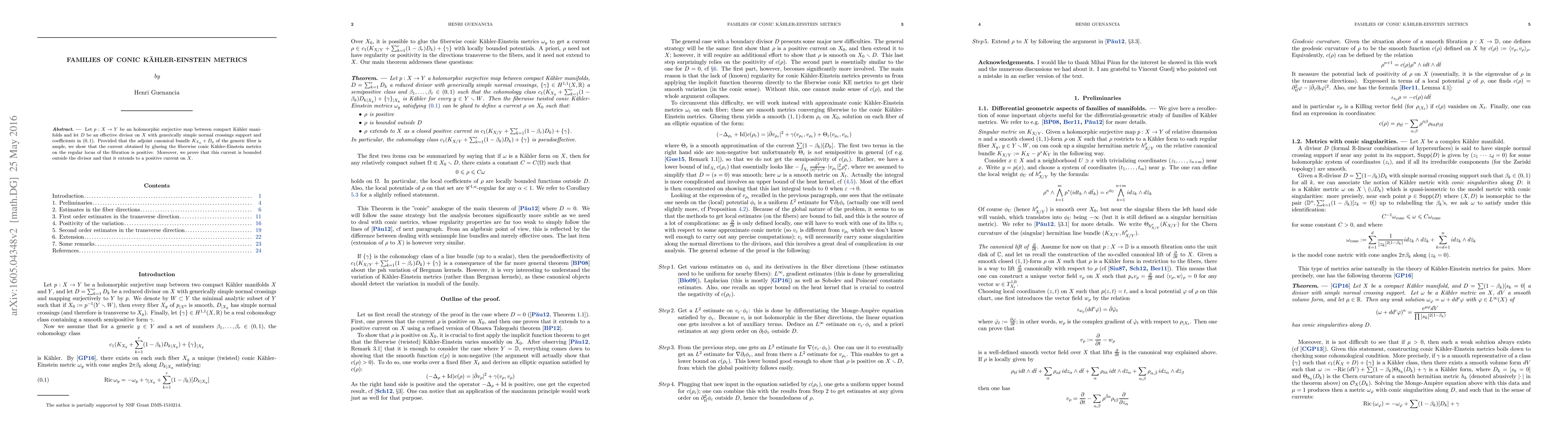 This paper demonstrates that under certain conditions, the current formed by gluing conic Kähler-Einstein metrics on the regular locus of a fibration is positive, bounded outside a specified divisor, and extends to a positive current on the entire manifold. This result provides insight into the existence and behavior of Kähler-Einstein metrics in complex geometry.