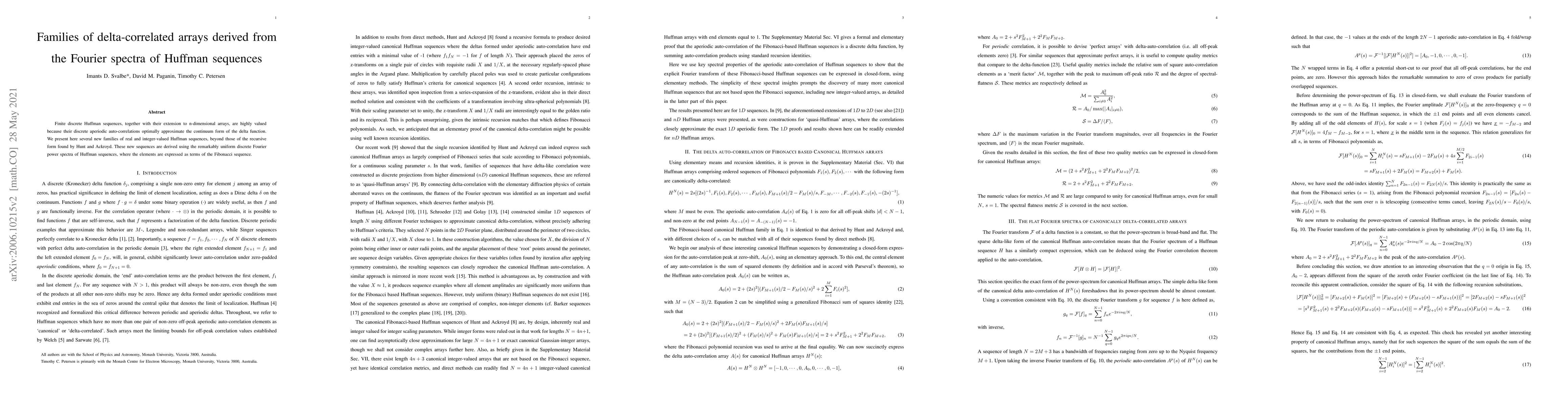 Summary: The paper introduces new families of real and integer-valued Huffman sequences derived from the uniform discrete Fourier spectra, extending beyond Hunt and Ackroyd's recursive forms. These sequences exhibit optimal discrete aperiodic auto-correlations approximating the delta function.
