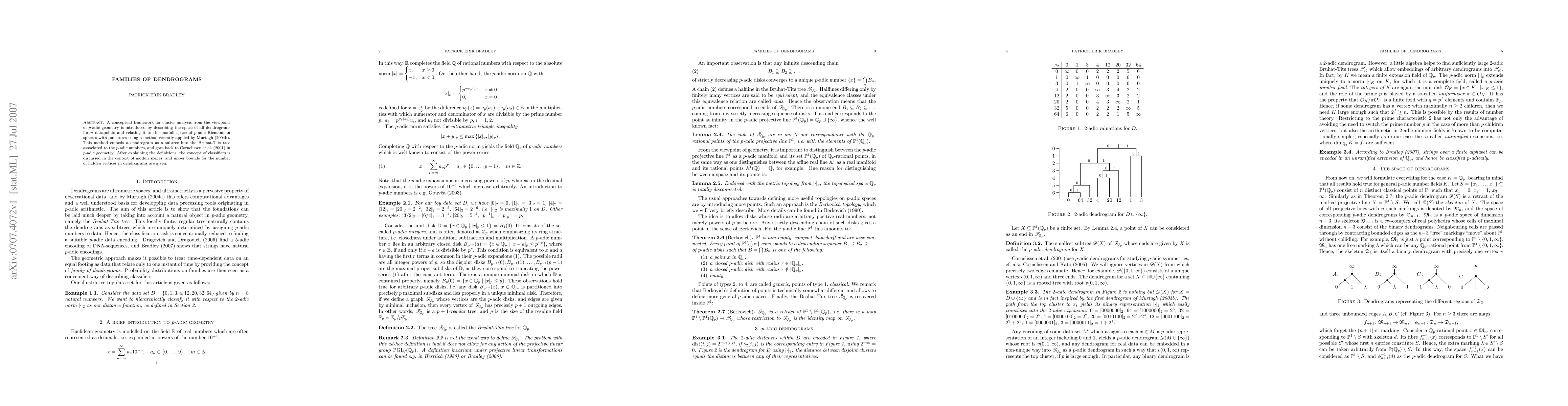 The paper presents a novel approach to cluster analysis using p-adic geometry, embedding dendrograms as subtrees in the Bruhat-Tits tree and relating them to moduli spaces of p-adic Riemannian spheres with punctures.