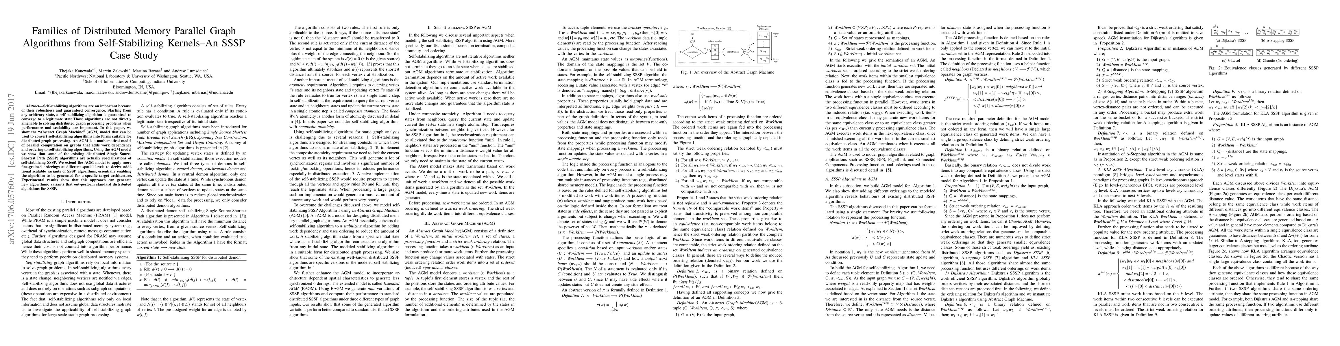 Self-stabilizing algorithms are an important because of their robustness and guaranteed convergence. Starting from any arbitrary state, a self-stabilizing algorithm is guaranteed to converge to a legitimate state.Those algorithms are not directly amenable to solving distributed graph processing problems when performance and scalability are important. In this paper, we show the "Abstract Graph Machine" (AGM) model that can be used to convert self-stabilizing algorithms into forms suitable for distributed graph processing. An AGM is a mathematical model of parallel computation on graphs that adds work dependency and ordering to self-stabilizing algorithms. Using the AGM model we show that some of the existing distributed Single Source Shortest Path (SSSP) algorithms are actually specializations of self-stabilizing SSSP. We extend the AGM model to apply more fine-grained orderings at different spatial levels to derive additional scalable variants of SSSP algorithms, essentially enabling the algorithm to be generated for a specific target architecture. Experimental results show that this approach can generate new algorithmic variants that out-perform standard distributed algorithms for SSSP.