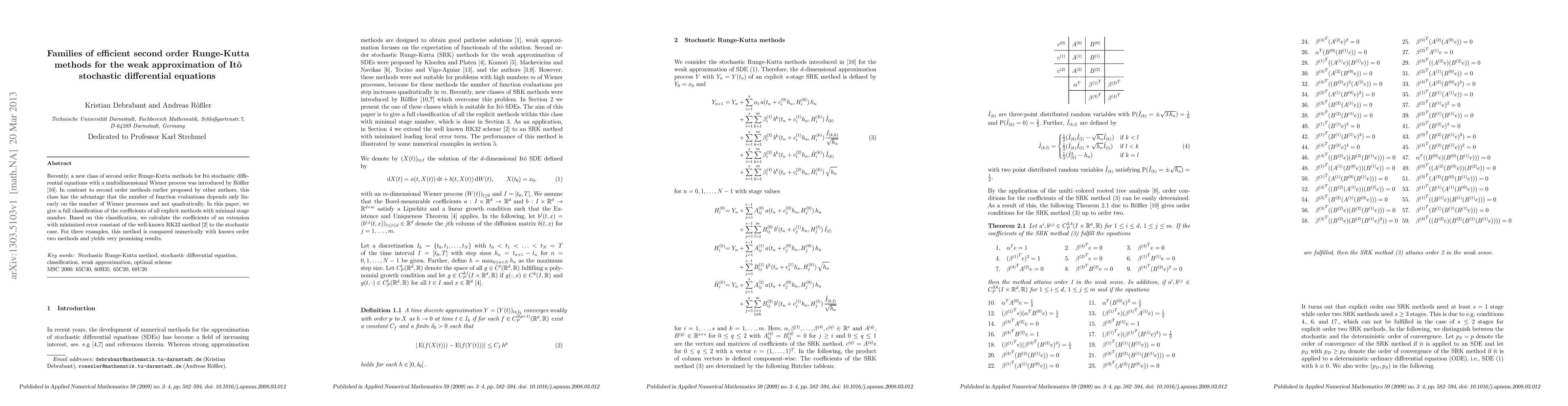 This paper classifies coefficients of efficient second order Runge-Kutta methods for Itô stochastic differential equations, minimizing function evaluations. An extended RK32 method is developed for stochastic cases, showing promising numerical results compared to other second-order methods.