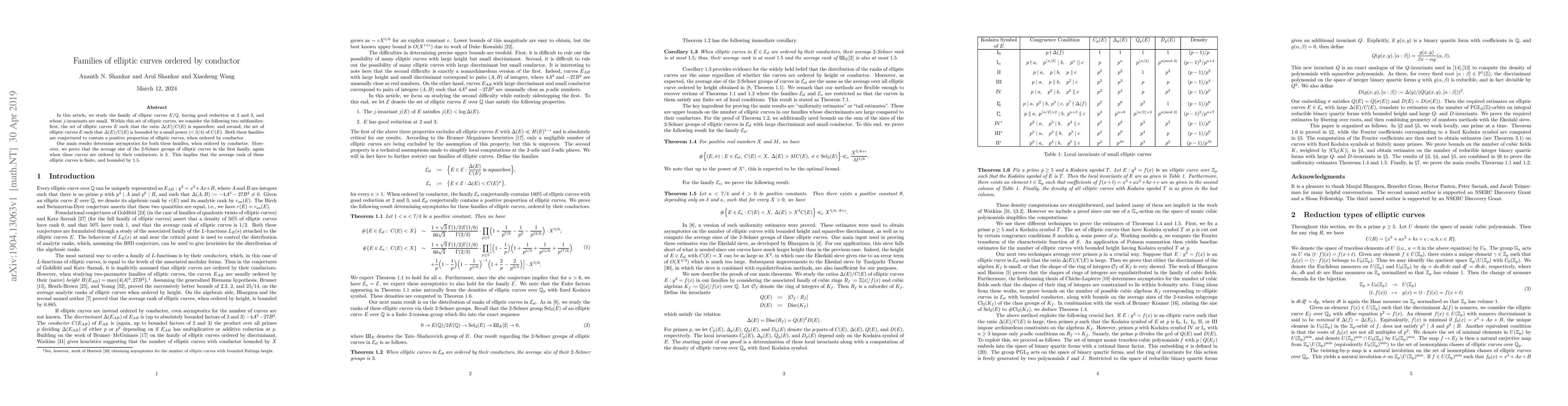 In this article, we study the family of elliptic curves $E/\mathbb{Q}$, having good reduction at $2$ and $3$, and whose $j$-invariants are small. Within this set of elliptic curves, we consider the following two subfamilies: first, the set of elliptic curves $E$ such that the ratio $\Delta(E)/C(E)$ is squarefree; and second, the set of elliptic curves $E$ such that $\Delta(E)/C(E)$ is bounded by a small power $(<3/4)$ of $C(E)$. Both these families are conjectured to contain a positive proportion of elliptic curves, when ordered by conductor. Our main results determine asymptotics for both these families, when ordered by conductor. Moreover, we prove that the average size of the $2$-Selmer groups of elliptic curves in the first family, again when these curves are ordered by their conductors, is $3$. This implies that the average rank of these elliptic curves is finite, and bounded by $1.5$.