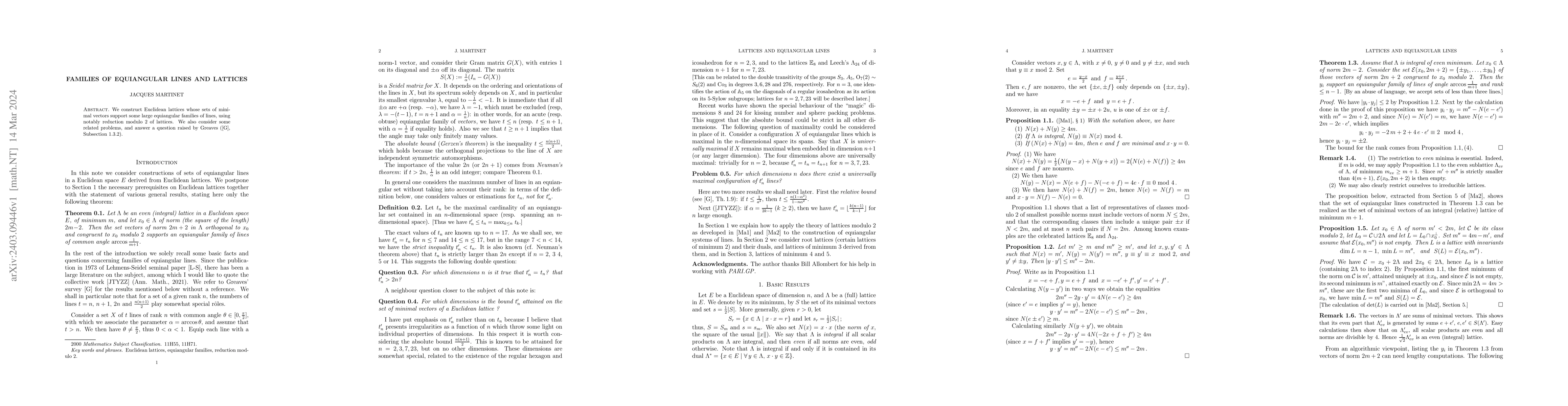 The paper constructs Euclidean lattices supporting large equiangular families of lines through reduction modulo 2 techniques. It also addresses related problems and answers a question posed by Greaves.