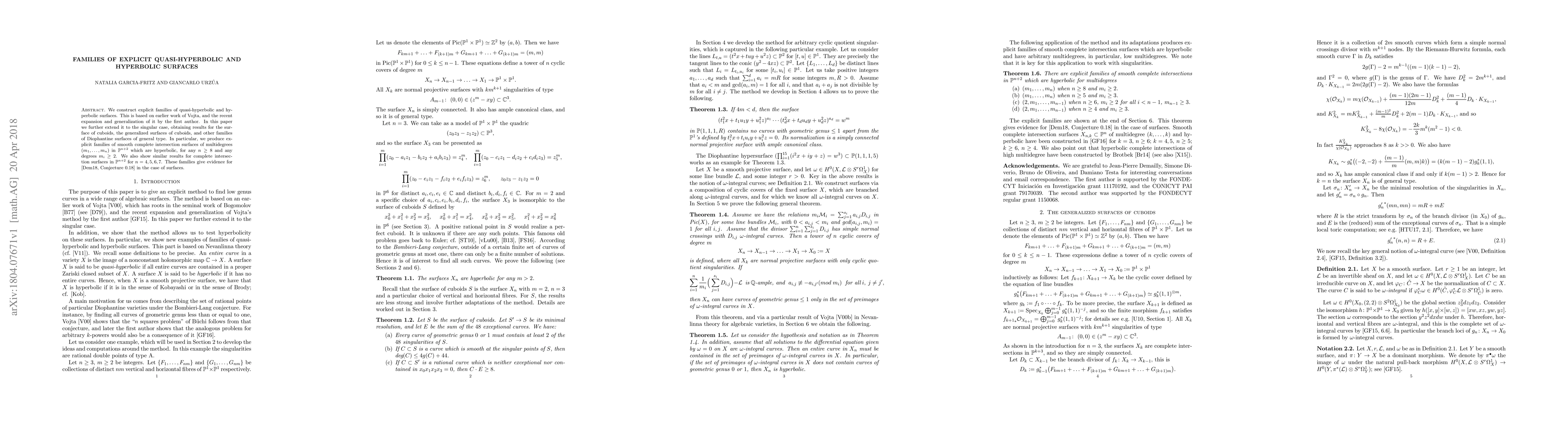 This paper constructs explicit families of quasi-hyperbolic and hyperbolic surfaces, extending previous work by Vojta and the first author to include singular cases. It produces explicit families of smooth complete intersection surfaces in projective spaces that are hyperbolic, supporting a conjecture in the context of Diophantine surfaces.