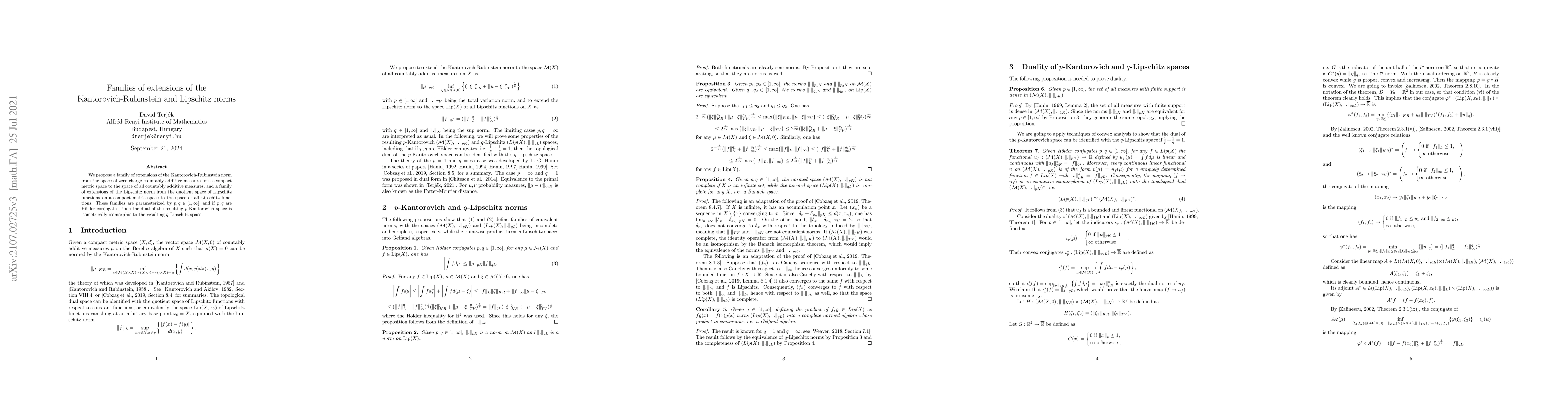This research paper introduces new norms extending Kantorovich-Rubinstein and Lipschitz norms to broader spaces of measures and functions, with a focus on H"older conjugates leading to isometric isomorphism between the resulting spaces.