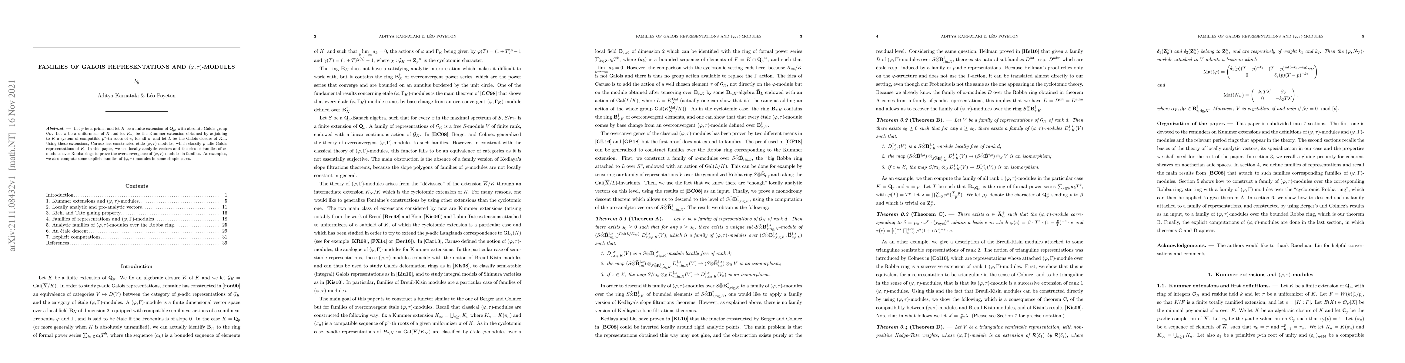 This paper explores the construction of étale $(\varphi, \tau)$-modules to classify $p$-adic Galois representations of $K$, and uses locally analytic vectors and families of $\varphi$-modules to prove the overconvergence of these modules in families. Explicit examples of such families are also computed in simple cases.