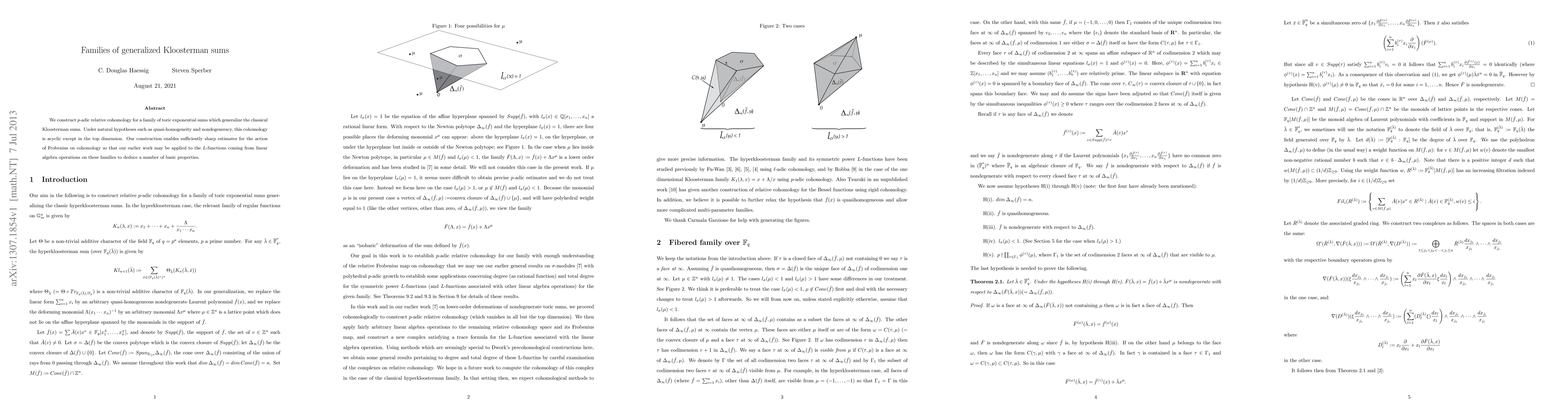 This paper constructs p-adic relative cohomology for a family of generalized Kloosterman sums, showing it is acyclic except in the top dimension under certain conditions. The construction allows for precise estimates on Frobenius action, enabling the application of earlier work to deduce fundamental properties of associated L-functions.