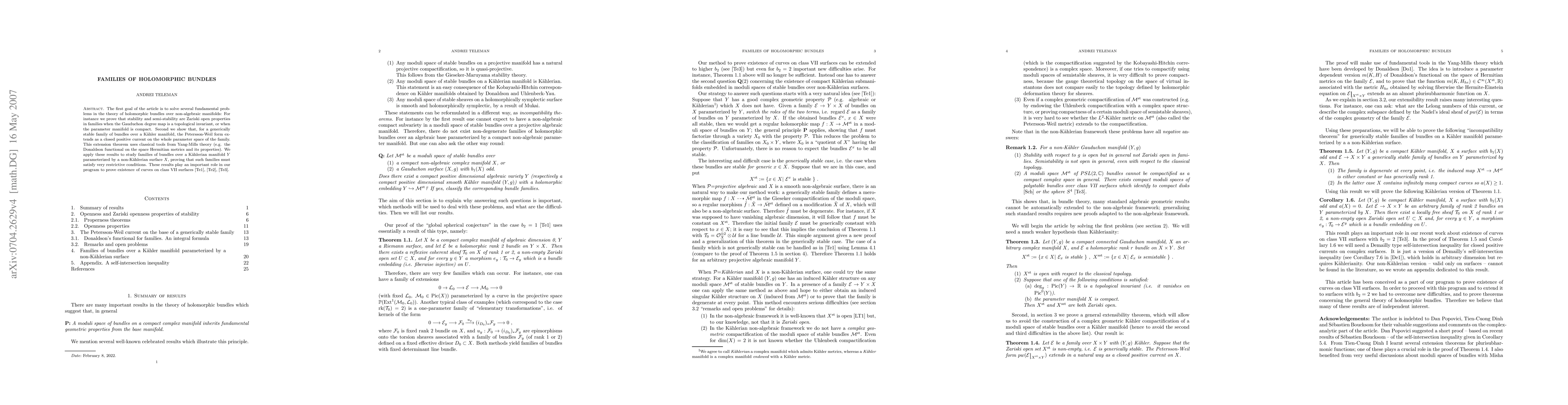 The paper addresses fundamental problems in holomorphic bundle theory, proving that stability properties are Zariski open under certain conditions and extending the Petersson-Weil form for stable bundle families on Kähler manifolds. These results are applied to families of bundles over non-Kählerian surfaces, leading to restrictive conditions on such bundles.