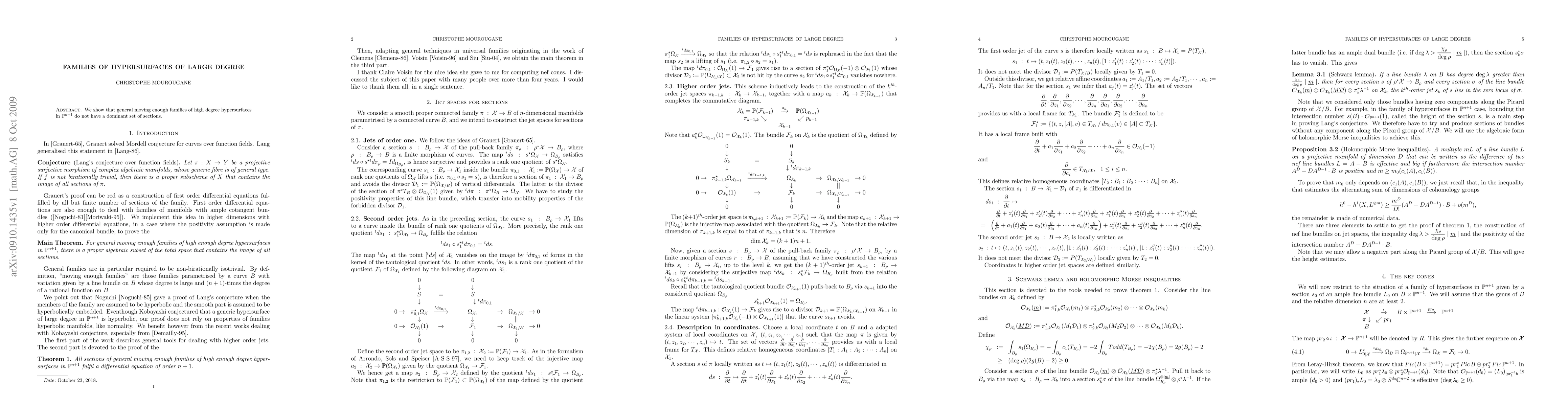 We show that general moving enough families of high enough degree hypersurfaces in a complex projective space do not have a dominant set of sections.