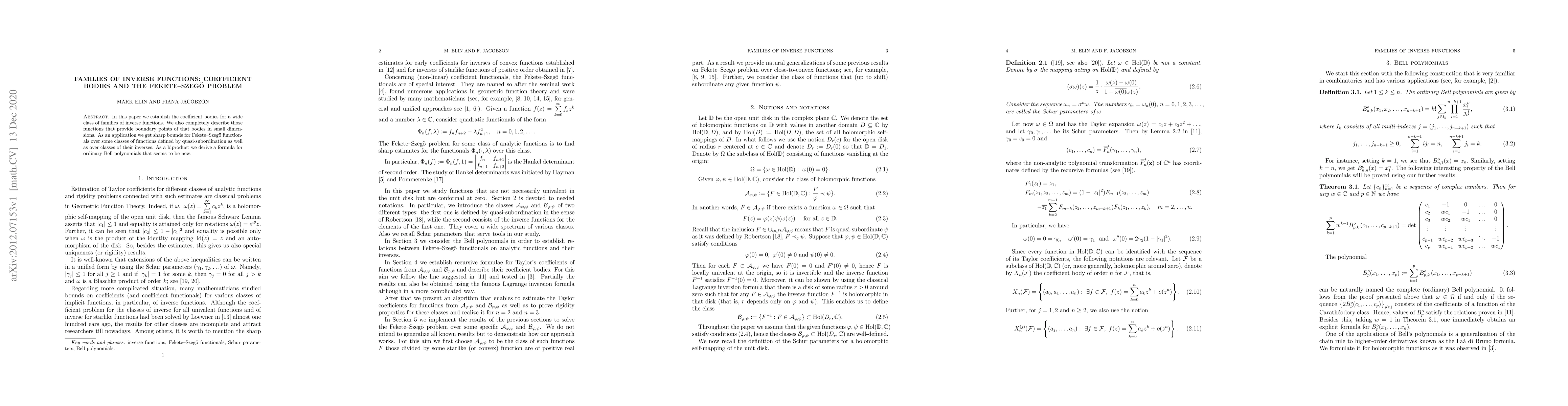 In this paper we establish the coefficient bodies for a wide class of families of inverse functions. We also completely describe those functions that provide boundary points of that bodies in small dimensions. As an application we get sharp bounds for Fekete--Szeg\"{o} functionals over some classes of functions defined by quasi-subordination as well as over classes of their inverses. As a biproduct we derive a formula for ordinary Bell polynomials that seems to be new.