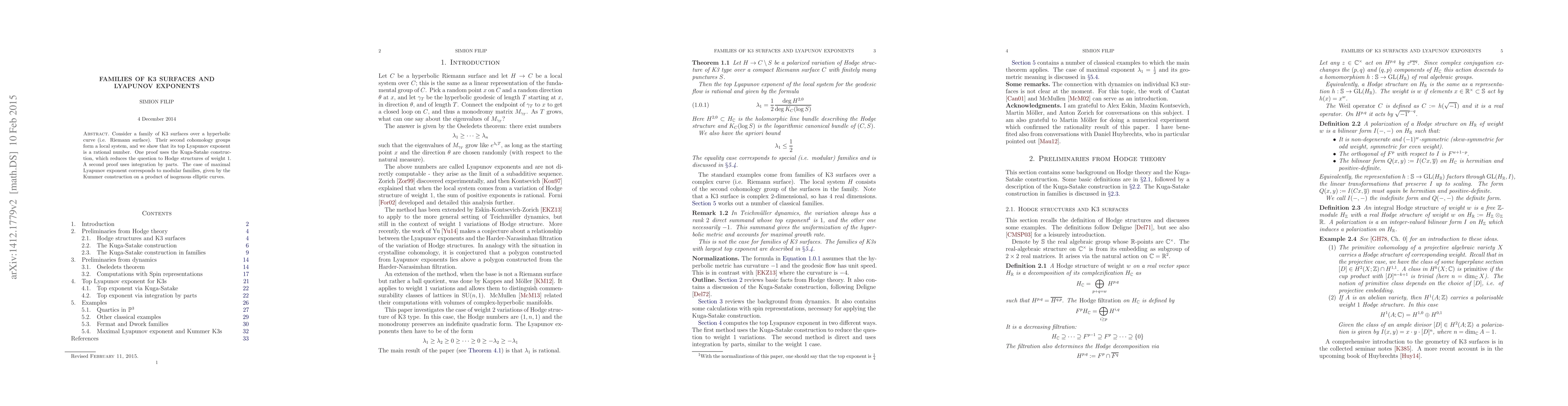 Consider a family of K3 surfaces over a hyperbolic curve (i.e. Riemann surface). Their second cohomology groups form a local system, and we show that its top Lyapunov exponent is a rational number. One proof uses the Kuga-Satake construction, which reduces the question to Hodge structures of weight 1. A second proof uses integration by parts. The case of maximal Lyapunov exponent corresponds to modular families, given by the Kummer construction on a product of isogenous elliptic curves.