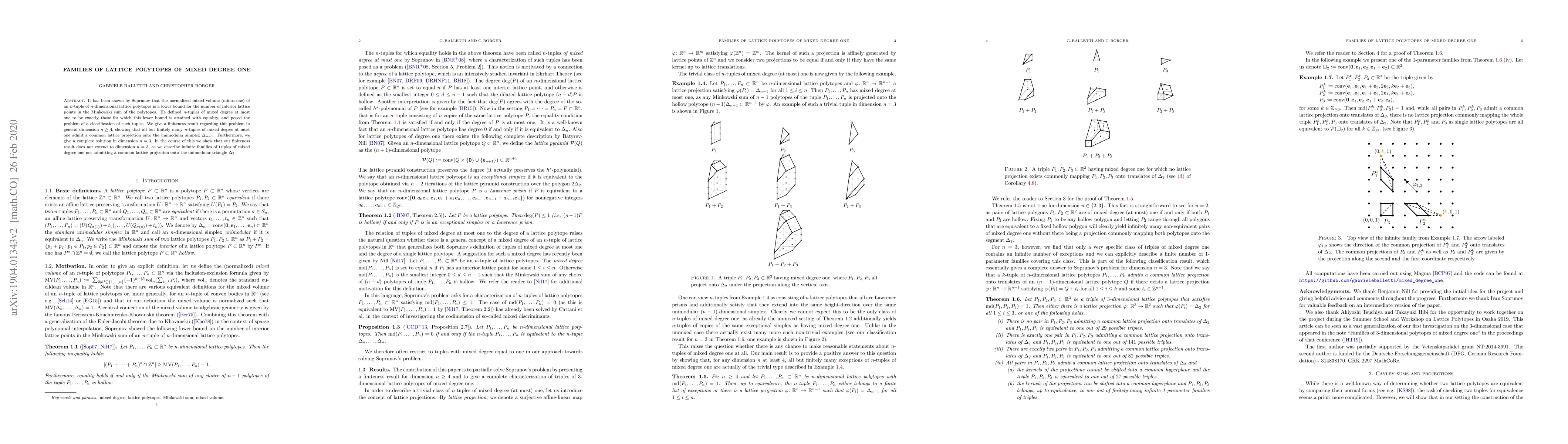 This paper classifies lattice polytopes of mixed degree one in dimensions $n \geq 4$, proving that all but finitely many such $n$-tuples share a common lattice projection onto the unimodular simplex $\Delta_{n-1}$. In dimension $n=3$, it finds infinite families of triples that do not share such a projection onto the unimodular triangle $\Delta_2$.