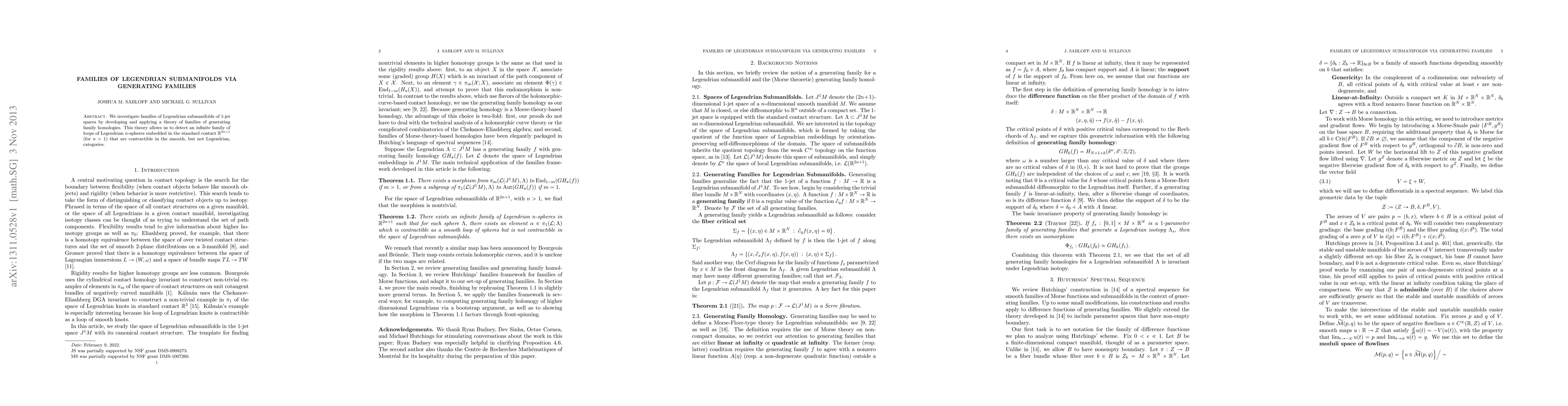 This paper develops a theory of generating family homologies to study families of Legendrian submanifolds in 1-jet spaces, revealing an infinite family of contractible Legendrian n-spheres in standard contact (2n+1)-spaces that are smooth but not Legendrian.