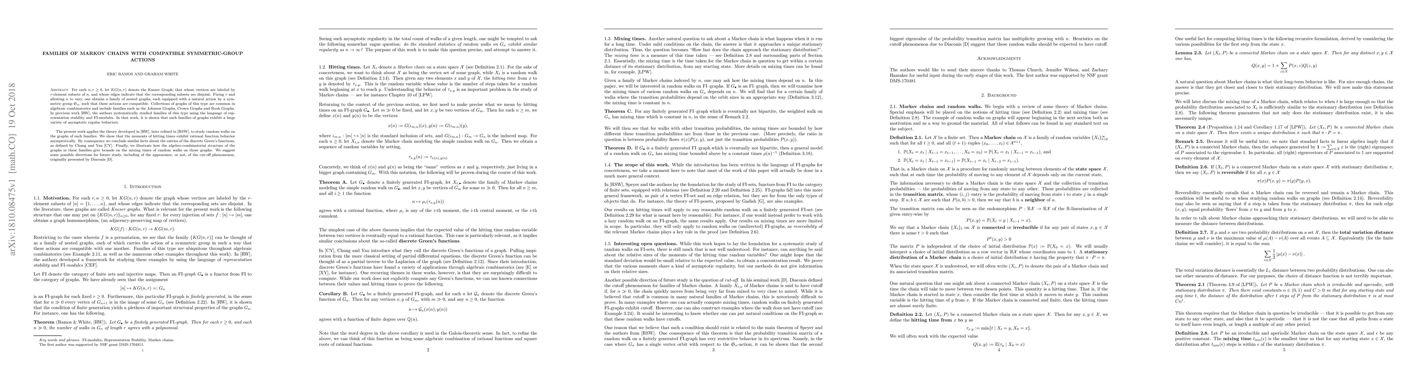 This paper studies random walks on a family of Markov chains with compatible symmetric-group actions, showing rational function behavior in hitting times and discrete Green's functions, with implications for mixing times and future study directions.