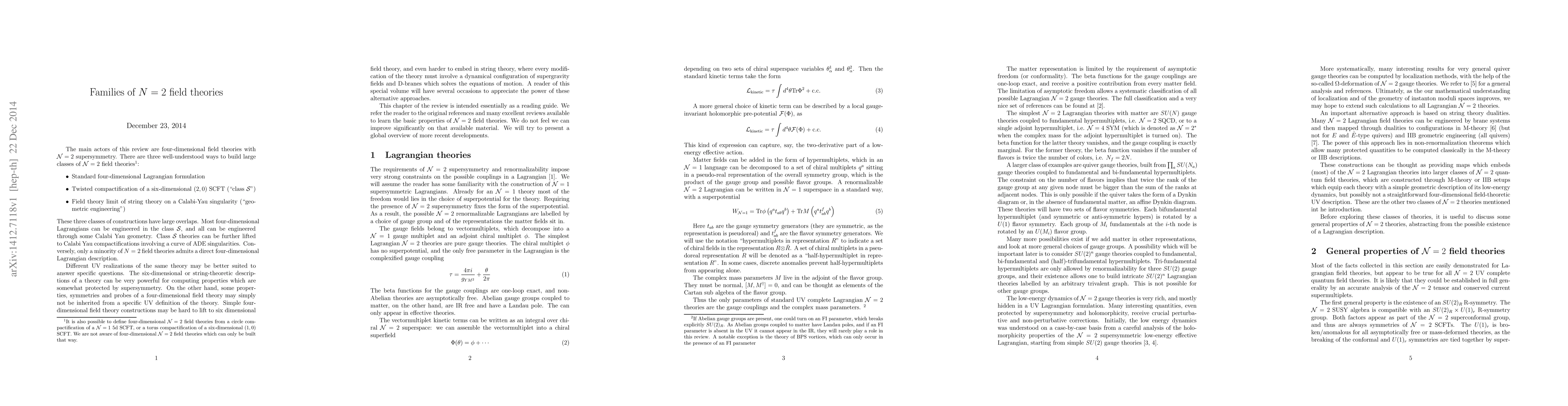 This is the first article in the collection of reviews "Exact results on N=2 supersymmetric gauge theories", ed. J. Teschner. It describes how large families of field theories with N=2 supersymmetry can be described by means of Lagrangian formulations, or by compactification from the six-dimensional theory with (2,0) supersymmetry on spaces of the form $M^4 \times C$, with C being a Riemann surface. The class of theories that can be obtained in this way is called class $\cal S$. This description allows us to relate key aspects of the four-dimensional physics of class $\cal S$ theories to geometric structures on C.