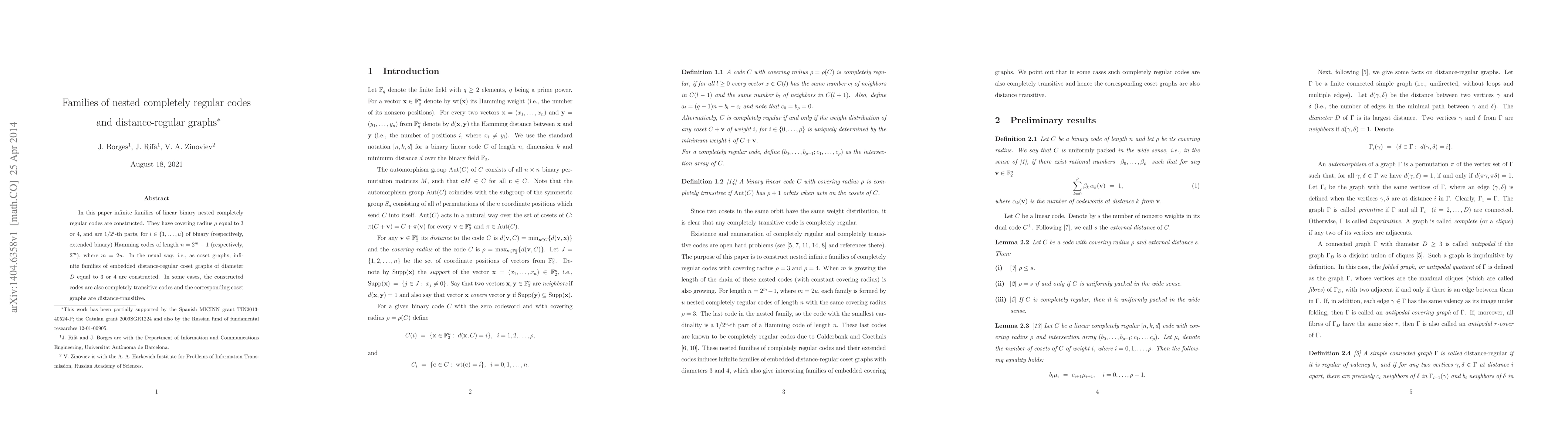 This paper constructs infinite families of linear binary nested completely regular codes with covering radii of 3 or 4, derived from binary Hamming codes. It also builds embedded distance-regular coset graphs of diameter 3 or 4, some of which are distance-transitive.