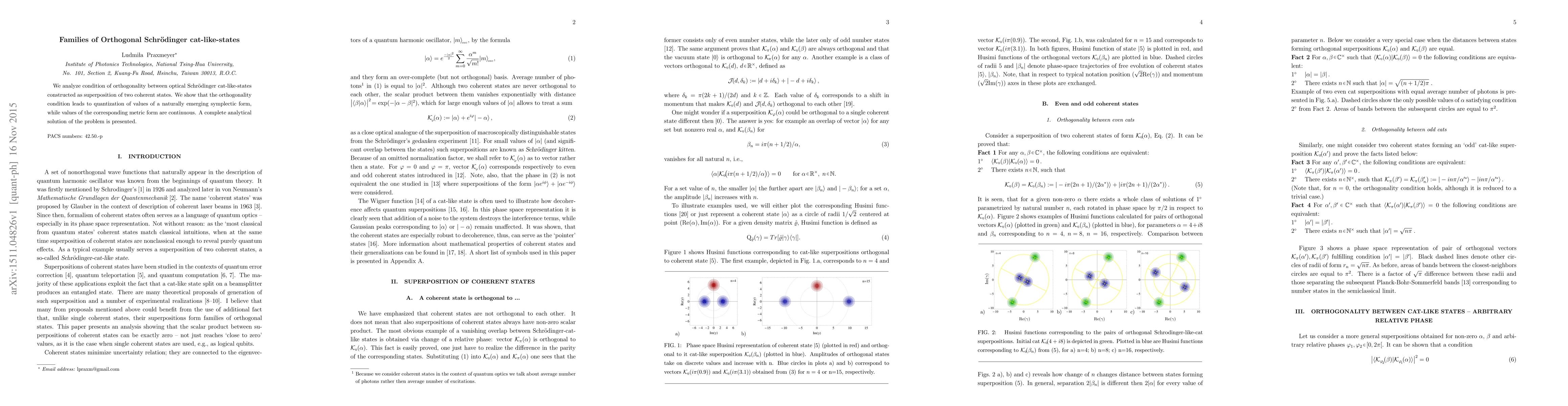 We analyze condition of orthogonality between optical Schrodinger cat-like-states constructed as superposition of two coherent states. We show that the orthogonality condition leads to quantization of values of a naturally emerging symplectic form, while values of the corresponding metric form are continuous. A complete analytical solution of the problem is presented.