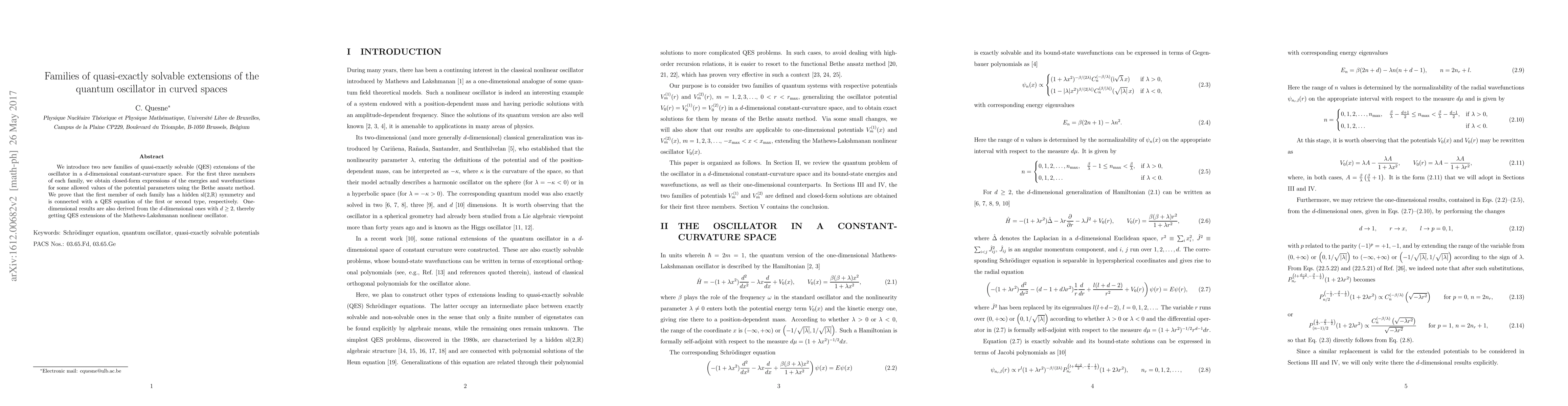 This paper introduces two new families of quasi-exactly solvable extensions of the quantum oscillator in curved spaces, deriving closed-form expressions for energies and wavefunctions using the Bethe ansatz method. It reveals hidden sl(2, $\mathbb{R}$) symmetry in the first member of each family and connects them to known QES equations.