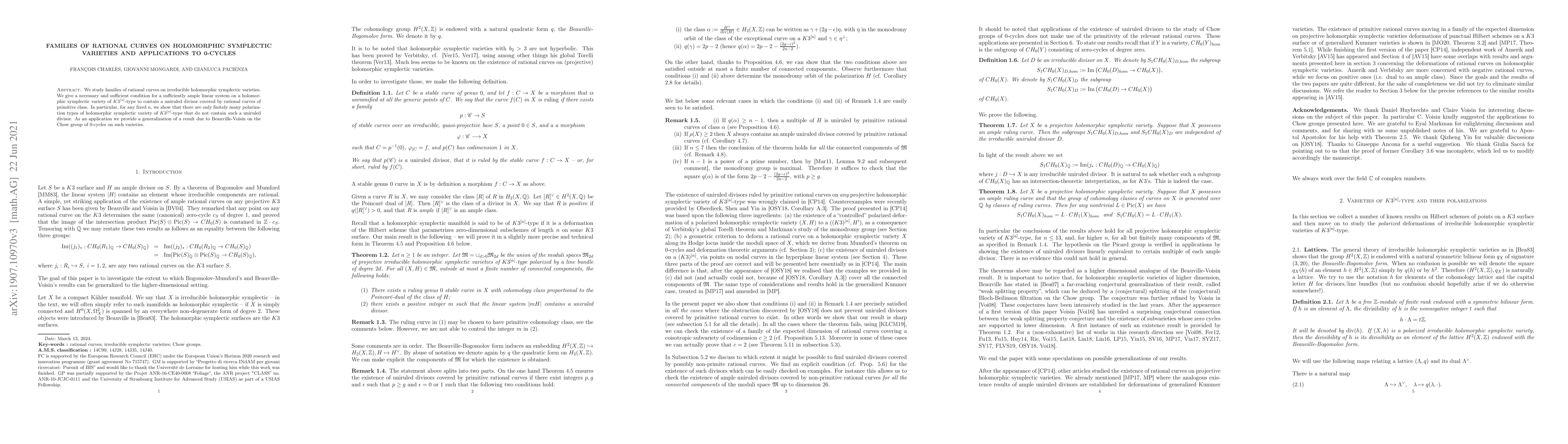 This paper investigates families of rational curves on irreducible holomorphic symplectic varieties, providing a condition for the presence of uniruled divisors covered by rational curves. It concludes that only finitely many polarization types of $K3^{[n]}$-type varieties lack such divisors, and extends Beauville-Voisin's result on the Chow group of zero-cycles.