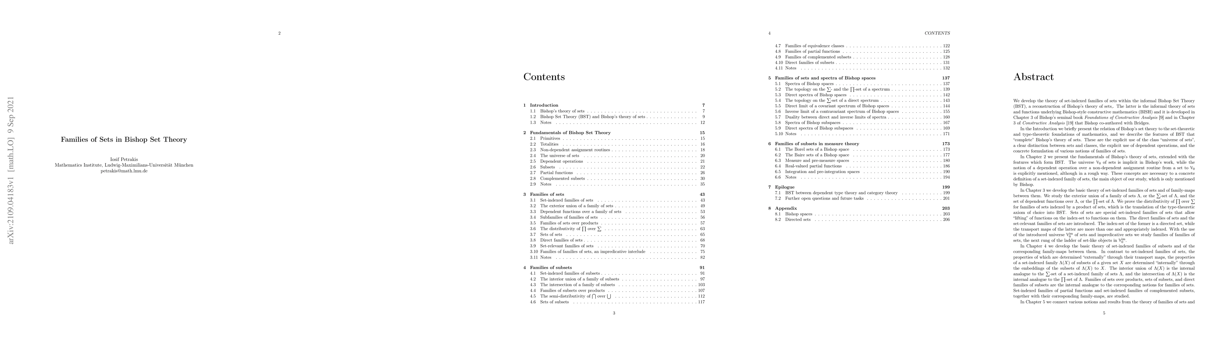 This paper explores the concept of set-indexed families of sets and subsets within Bishop Set Theory (BST), aiming to reconstruct and formalize Bishop's foundational set theory framework. The study focuses on the structural and relational properties of these families in BST.