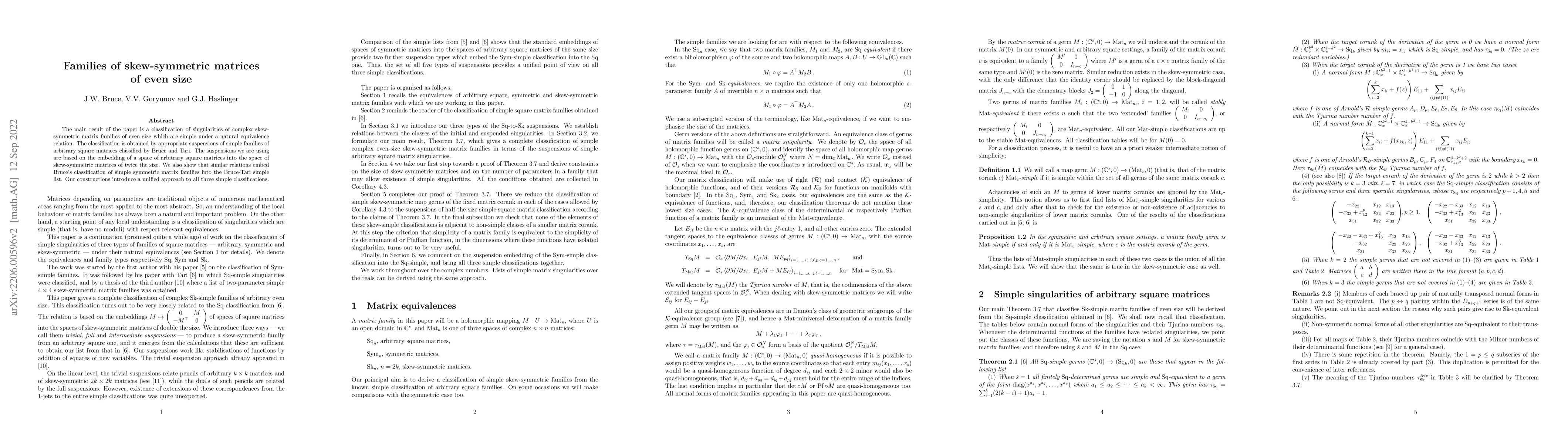 This paper classifies singularities of complex skew-symmetric matrix families of even size, using suspensions based on embedding techniques. It also demonstrates how these methods unify the classifications of simple symmetric and skew-symmetric matrix families.