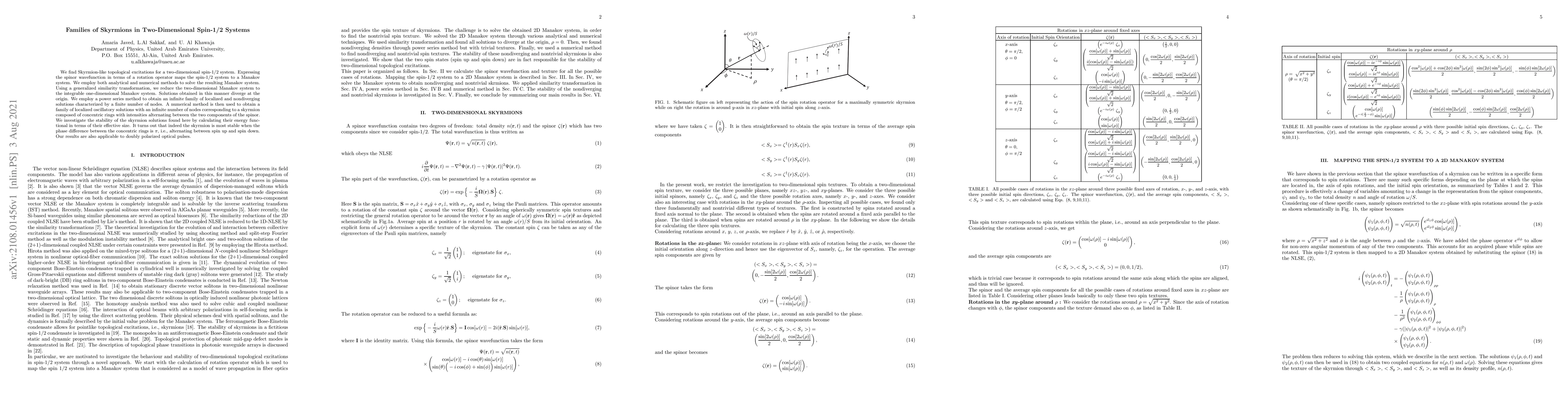 We find Skyrmion-like topological excitations for a two-dimensional spin-1/2 system. Expressing the spinor wavefunction in terms of a rotation operator maps the spin-1/2 system to a Manakov system. We employ both analytical and numerical methods to solve the resulting Manakov system. Using a generalized similarity transformation, we reduce the two-dimensional Manakov system to the integrable one-dimensional Manakov system. Solutions obtained in this manner diverge at the origin. We employ a power series method to obtain an infinite family of localized and nondiverging solutions characterized by a finite number of nodes. A numerical method is then used to obtain a family of localized oscillatory solutions with an infinite number of nodes corresponding to a skyrmion composed of concentric rings with intensities alternating between the two components of the spinor. We investigate the stability of the skyrmion solutions found here by calculating their energy functional in terms of their effective size. It turns out that indeed the skyrmion is most stable when the phase difference between the concentric rings is $\pi$, i.e., alternating between spin up and spin down. Our results are also applicable to doubly polarized optical pulses.