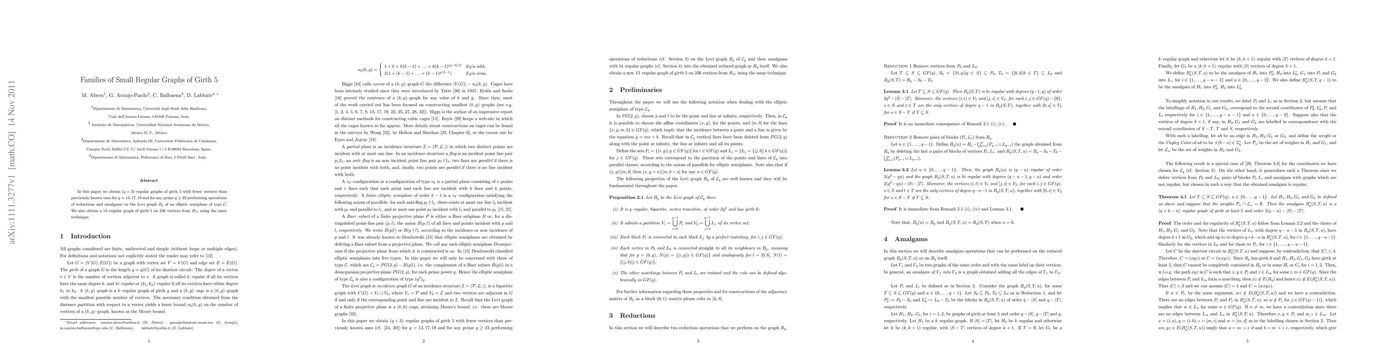 In this paper we obtain $(q+3)$--regular graphs of girth 5 with fewer vertices than previously known ones for $q=13,17,19$ and for any prime $q \ge 23$ performing operations of reductions and amalgams on the Levi graph $B_q$ of an elliptic semiplane of type ${\cal C}$. We also obtain a 13-regular graph of girth 5 on 236 vertices from $B_{11}$ using the same technique.