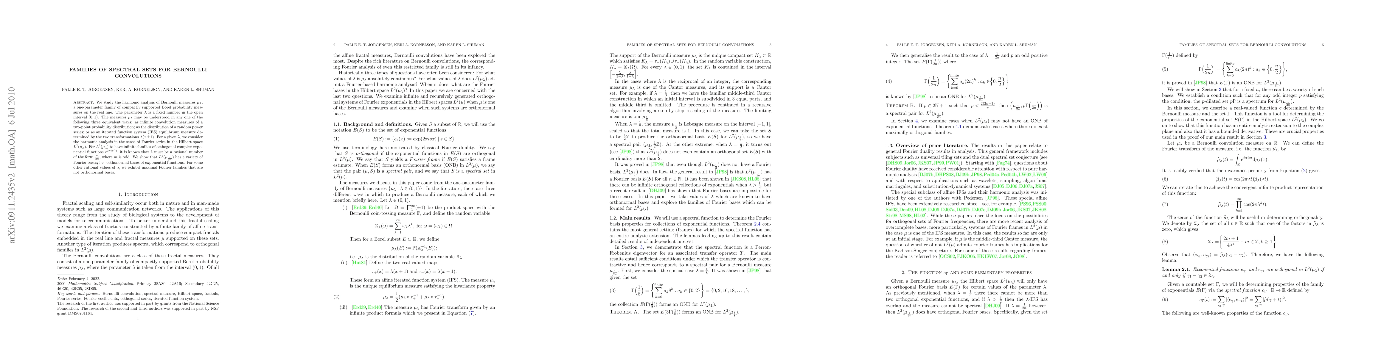 In this paper, we study the harmonic analysis of Bernoulli measures. We show a variety of orthonormal Fourier bases for the L^2 Hilbert spaces corresponding to certain Bernoulli measures, making use of contractive transfer operators. For other cases, we exhibit maximal Fourier families that are not orthonormal bases.