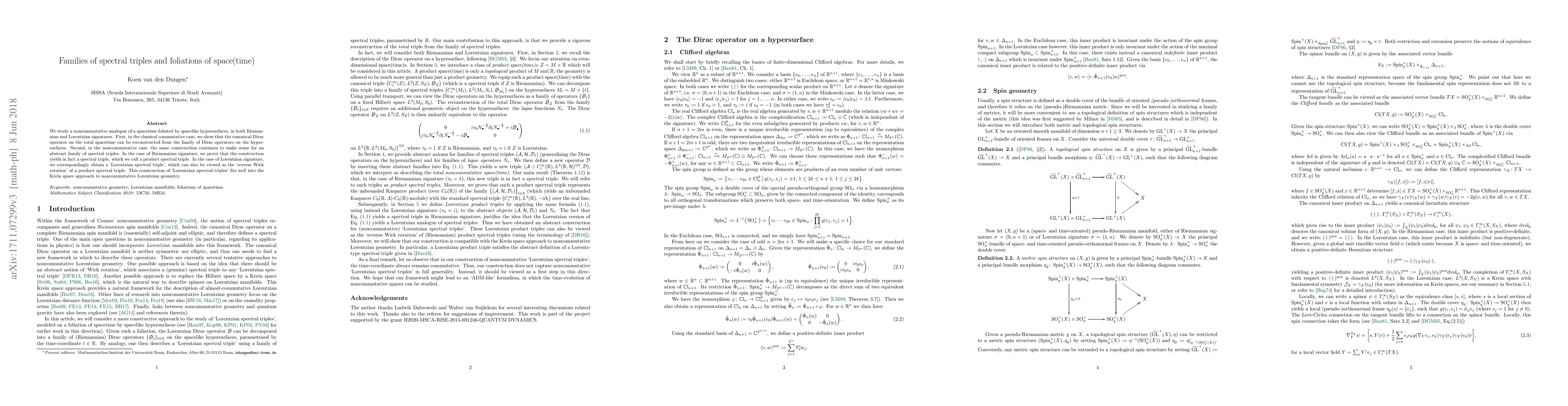 This paper explores noncommutative analogues of spacetime foliations by spacelike hypersurfaces, demonstrating how the canonical Dirac operator can be reconstructed from Dirac operators on hypersurfaces. It constructs product spectral triples for Riemannian signatures and Lorentzian spectral triples for Lorentzian signatures, fitting into the Krein space approach to noncommutative geometry.