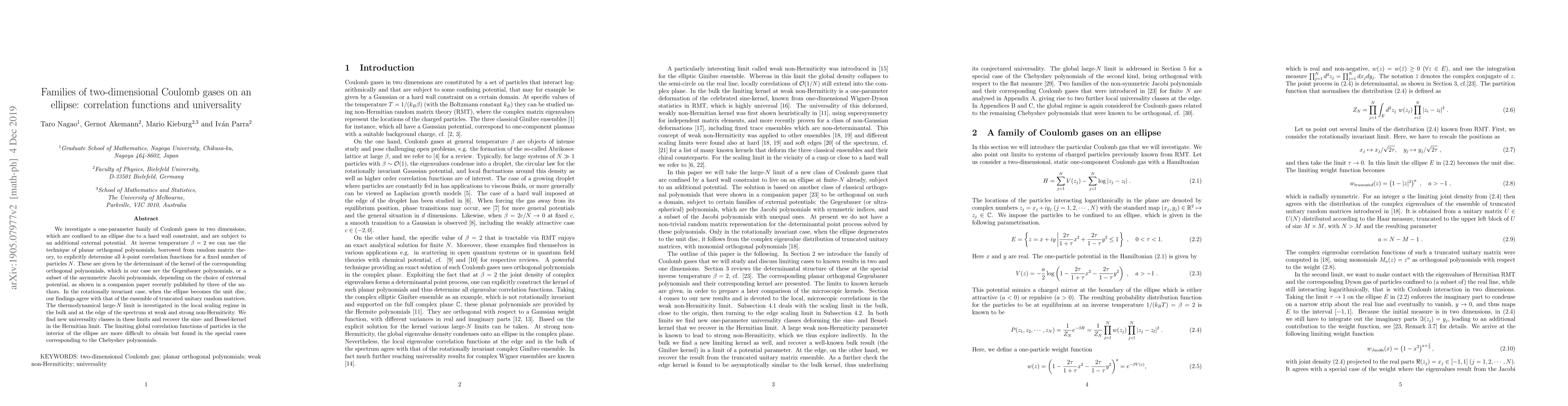 This paper explores a family of two-dimensional Coulomb gases confined to an ellipse, determining $k$-point correlation functions using planar orthogonal polynomials. It finds new universality classes in the thermodynamical large-$N$ limit and recovers known kernels in the Hermitian limit, with special cases corresponding to Chebyshev polynomials.