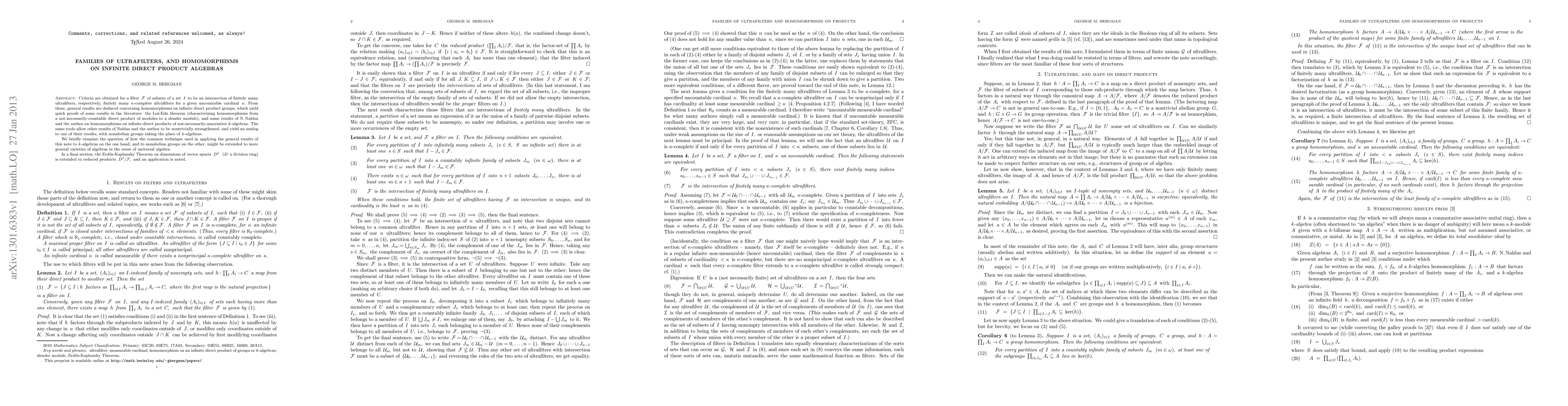 Criteria are obtained for a filter F of subsets of a set I to be an intersection of finitely many ultrafilters, respectively, finitely many \kappa-complete ultrafilters for a given uncountable cardinal \kappa. From these, general results are deduced concerning homomorphisms on infinite direct product groups, which yield quick proofs of some results in the literature: the {\L}o\'{s}-Eda theorem (characterizing homomorphisms from a not-necessarily-countable direct product of modules to a slender module), and some results of N. Nahlus and the author on homomorphisms on infinite direct products of not-necessarily-associative k-algebras. The same tools allow other results of Nahlus and the author to be nontrivially strengthened, and yield an analog to one of their results, with nonabelian groups taking the place of k-algebras. We briefly examine the question of how the common technique used in applying the general results of this note to k-algebras on the one hand, and to nonabelian groups on the other, might be extended to more general varieties of algebras in the sense of universal algebra. In a final section, the Erd\H{o}s-Kaplansky Theorem on dimensions of vector spaces D^I (D a division ring) is extended to reduced products D^I/F, and an application is noted.