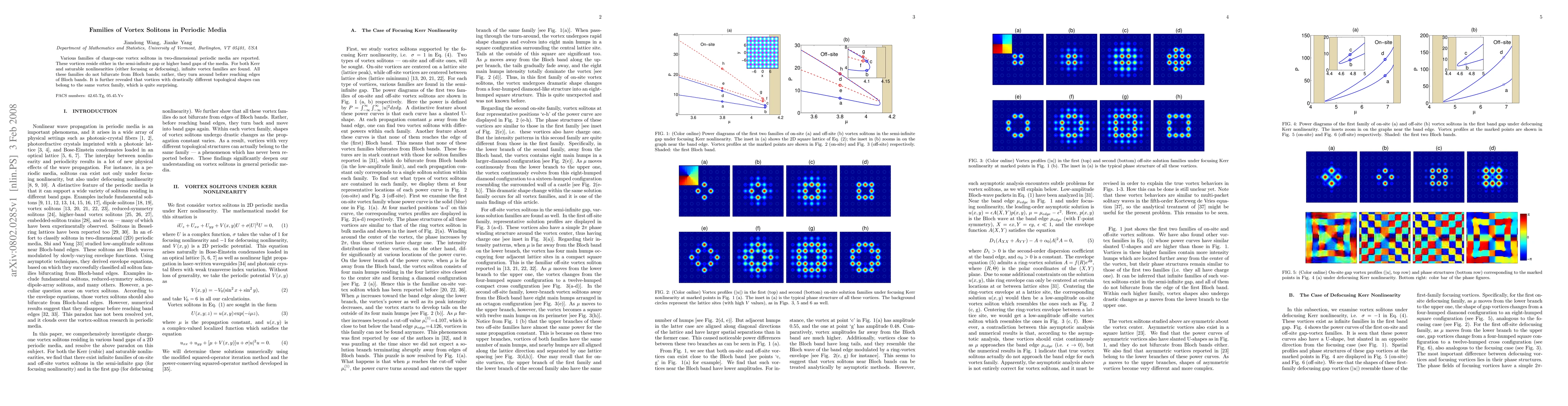 This paper reports on various families of charge-one vortex solitons in two-dimensional periodic media, residing in different band gaps. These vortex families, found for both Kerr and saturable nonlinearities, do not originate from Bloch bands but loop around before reaching their edges, and surprisingly, vortices with different topological shapes can belong to the same family.