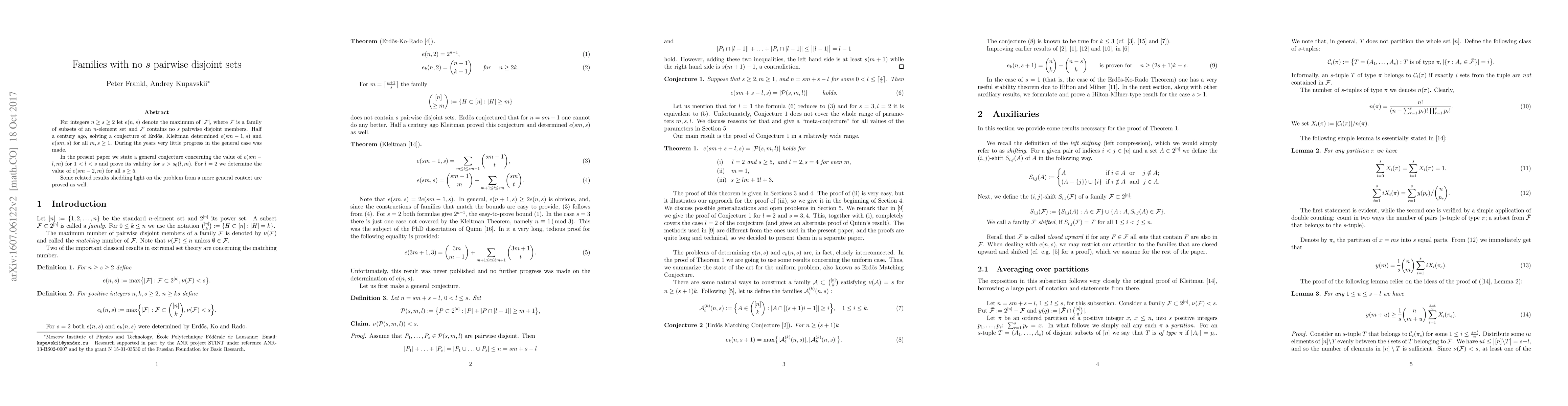 F$ contains no $s$ pairwise disjoint members. Half a century ago, solving a