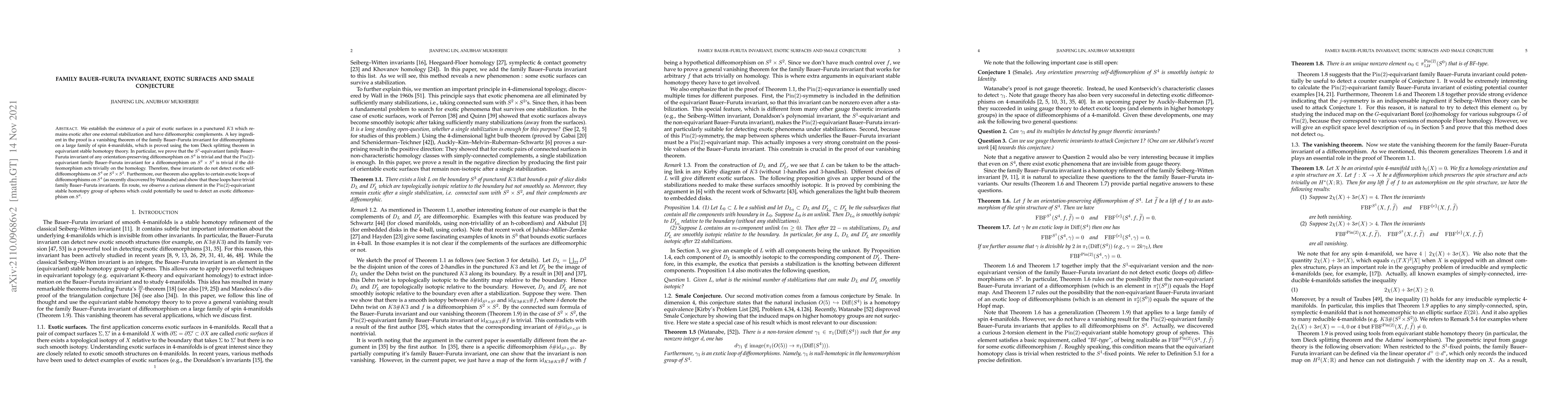 We establish the existence of a pair of exotic surfaces in a punctured $K3$ which remains exotic after one external stabilization and have diffeomorphic complements. A key ingredient in the proof is a vanishing theorem of the family Bauer--Furuta invariant for diffeomorphisms on a large family of spin 4-manifolds, which is proved using the tom Dieck splitting theorem in equivariant stable homotopy theory. In particular, we prove that the $S^{1}$-equivariant family Bauer--Furuta invariant of any orientation-preserving diffeomorphism on $S^{4}$ is trivial and that the $\mathrm{Pin}(2)$-equivariant family Bauer--Furuta invariant for a diffeomorphism on $S^{2}\times S^{2}$ is trivial if the diffeomorphism acts trivially on the homology. Therefore, these invariants do not detect exotic self-diffeomorphisms on $S^{4}$ or $S^{2}\times S^{2}$. Furthermore, our theorem also applies to certain exotic loops of diffeomorphisms on $S^{4}$ (as recently discovered by Watanabe) and show that these loops have trivial family Bauer--Furuta invariants. En route, we observe a curious element in the $\mathrm{Pin}(2)$-equivariant stable homotopy group of spheres which could potentially be used to detect an exotic diffeomorphism on $S^{4}$.