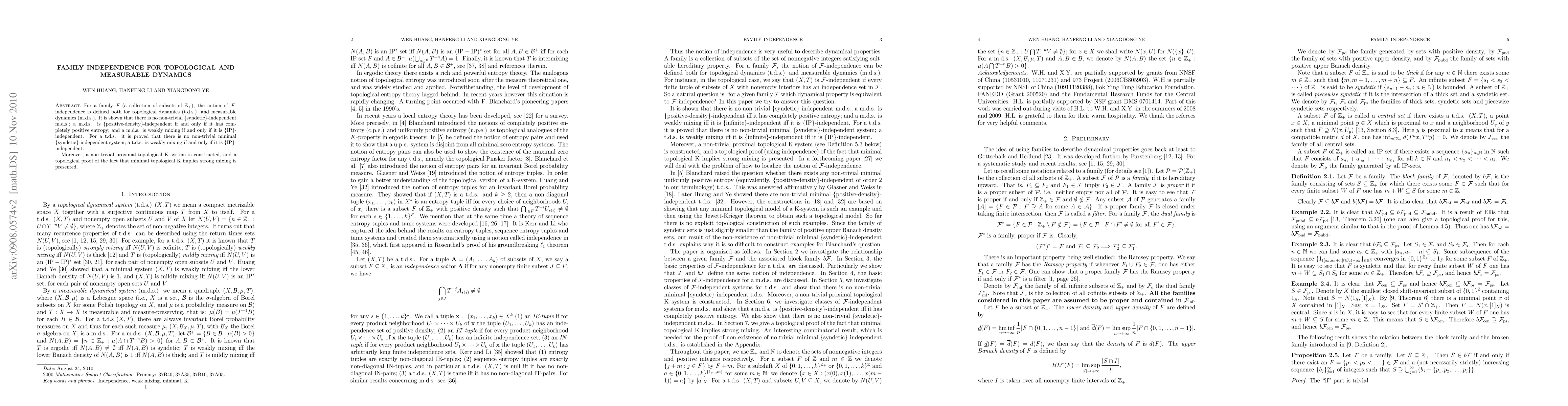 For a family F (a collection of subsets of Z_+), the notion of F-independence is defined both for topological dynamics (t.d.s.) and measurable dynamics (m.d.s.). It is shown that there is no non-trivial {syndetic}-independent m.d.s.; a m.d.s. is {positive-density}-independent if and only if it has completely positive entropy; and a m.d.s. is weakly mixing if and only if it is {IP}-independent. For a t.d.s. it is proved that there is no non-trivial minimal {syndetic}-independent system; a t.d.s. is weakly mixing if and only if it is {IP}-independent. Moreover, a non-trivial proximal topological K system is constructed, and a topological proof of the fact that minimal topological K implies strong mixing is presented.