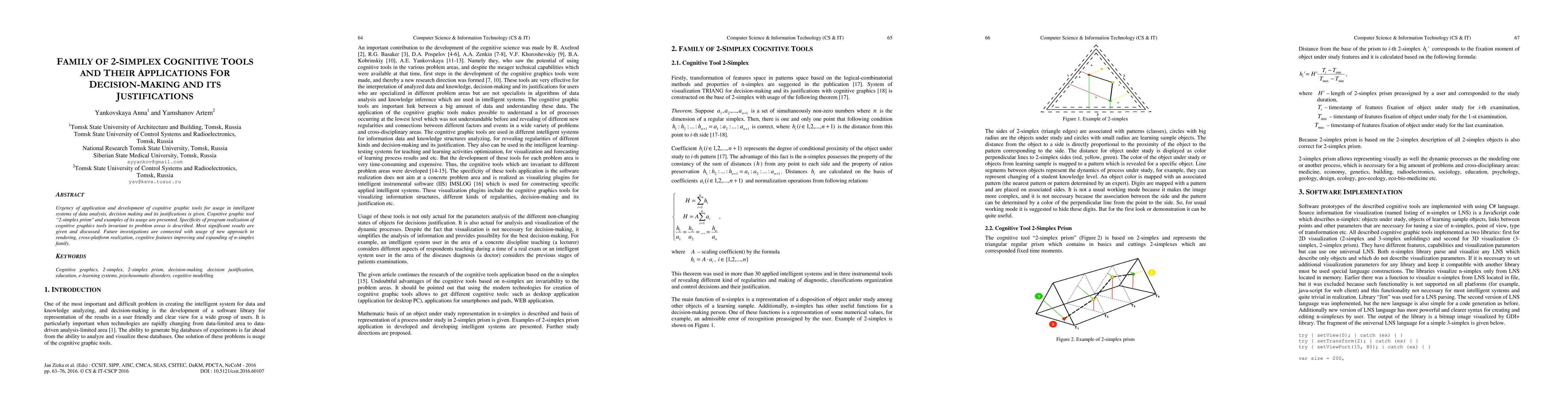 Urgency of application and development of cognitive graphic tools for usage in intelligent systems of data analysis, decision making and its justifications is given. Cognitive graphic tool "2-simplex prism" and examples of its usage are presented. Specificity of program realization of cognitive graphics tools invariant to problem areas is described. Most significant results are given and discussed. Future investigations are connected with usage of new approach to rendering, cross-platform realization, cognitive features improving and expanding of n-simplex family.