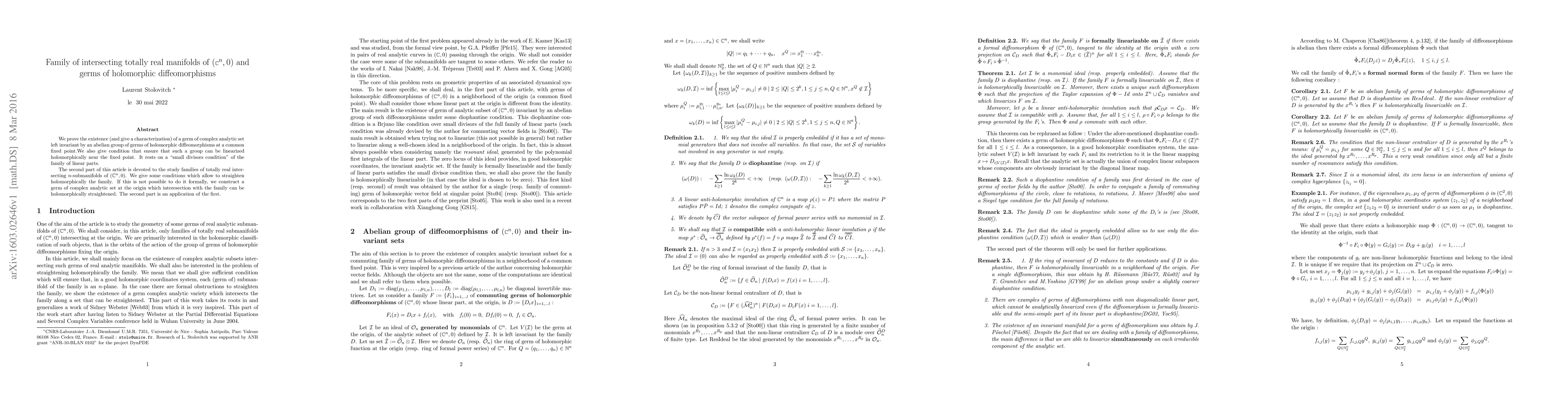 This paper proves the existence of a complex analytic set invariant under an abelian group of holomorphic diffeomorphisms at a fixed point, characterized by a "small divisors condition." It also explores families of intersecting totally real manifolds in $(C^n,0)$, providing conditions for their holomorphic straightening or constructing a complex analytic set for formal non-straightening cases.
