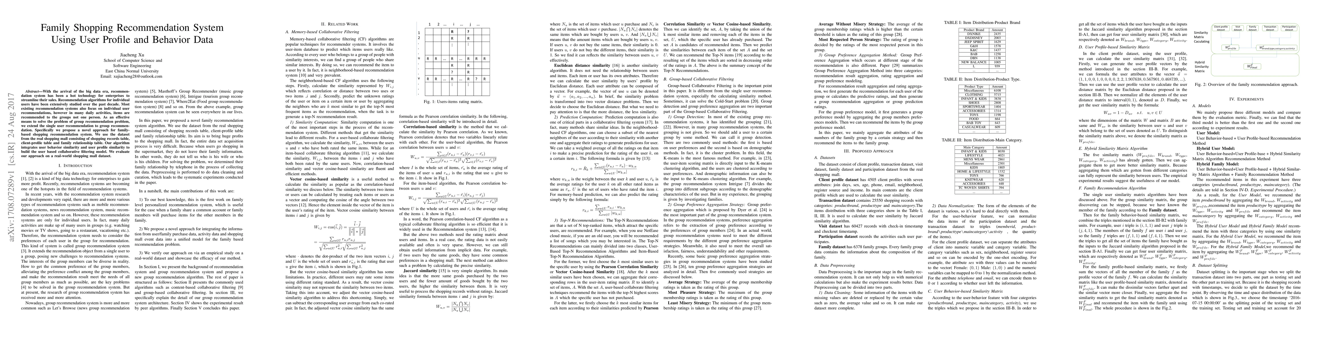 This paper proposes a novel family-based shopping recommendation system that integrates user behavior and profile similarities to generate group recommendations. The approach is evaluated using a real-world shopping mall dataset, demonstrating its effectiveness in addressing group recommendation challenges.
