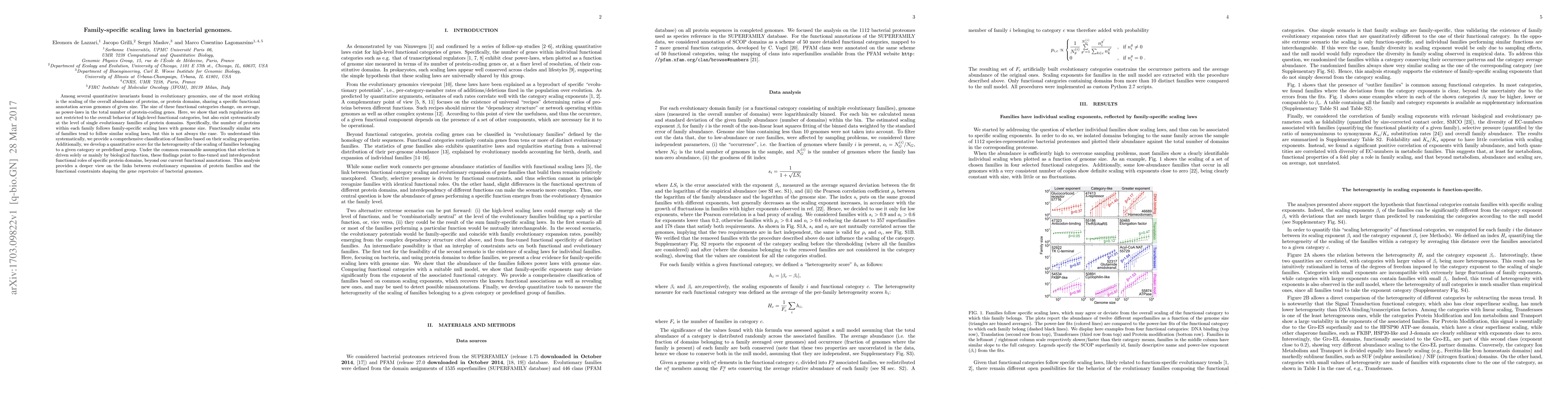 This paper reveals that bacterial genomes exhibit family-specific scaling laws for the number of proteins within each evolutionary family, suggesting fine-tuned functional roles beyond current annotations. The study classifies protein families based on their scaling properties and highlights the interdependence of these roles within the gene repertoire.