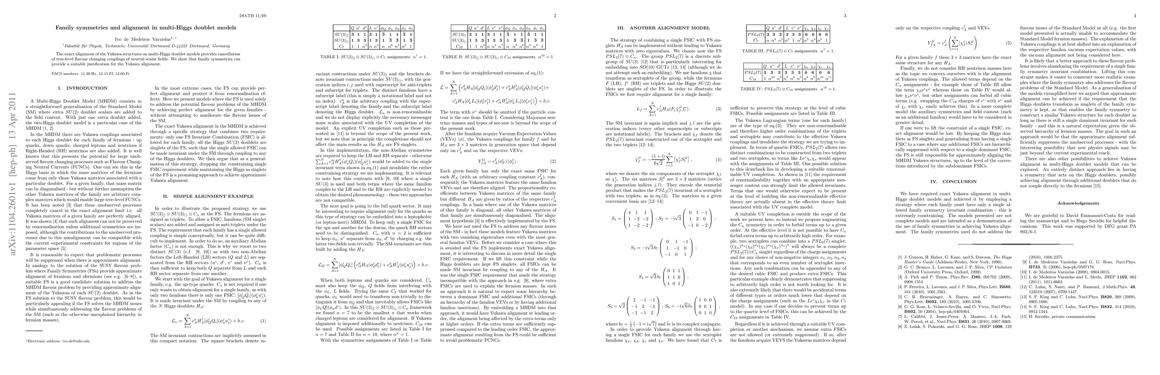 This paper explores how family symmetries in multi-Higgs doublet models can justify the exact alignment of Yukawa structures, which cancels tree-level flavour changing neutral scalar couplings, thus maintaining flavour conservation.