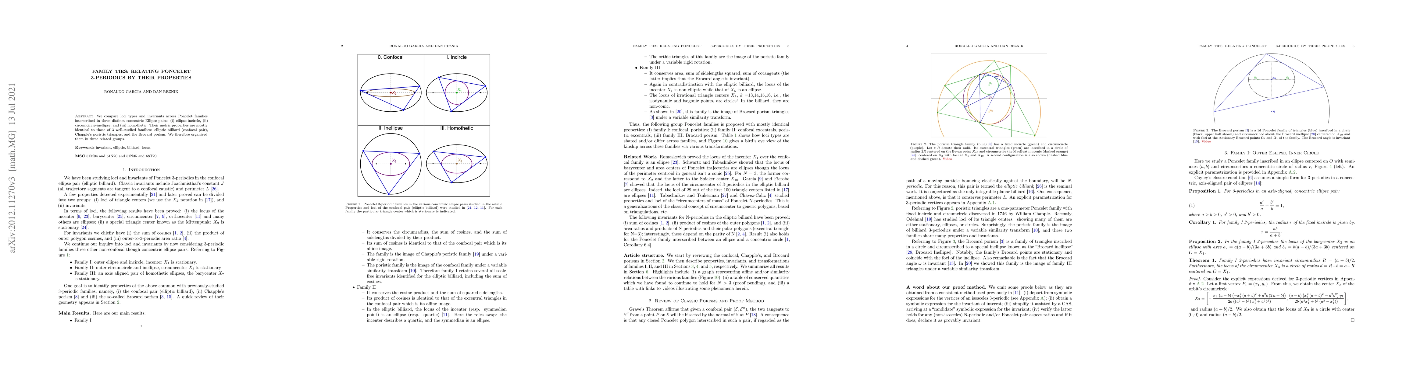 This paper examines the properties and invariants of Poncelet 3-periodicic loci across three distinct concentric ellipse pairs, revealing their strong similarities to well-known families like elliptic billiards and Chapple's poristic triangles, thereby categorizing them into three related groups.