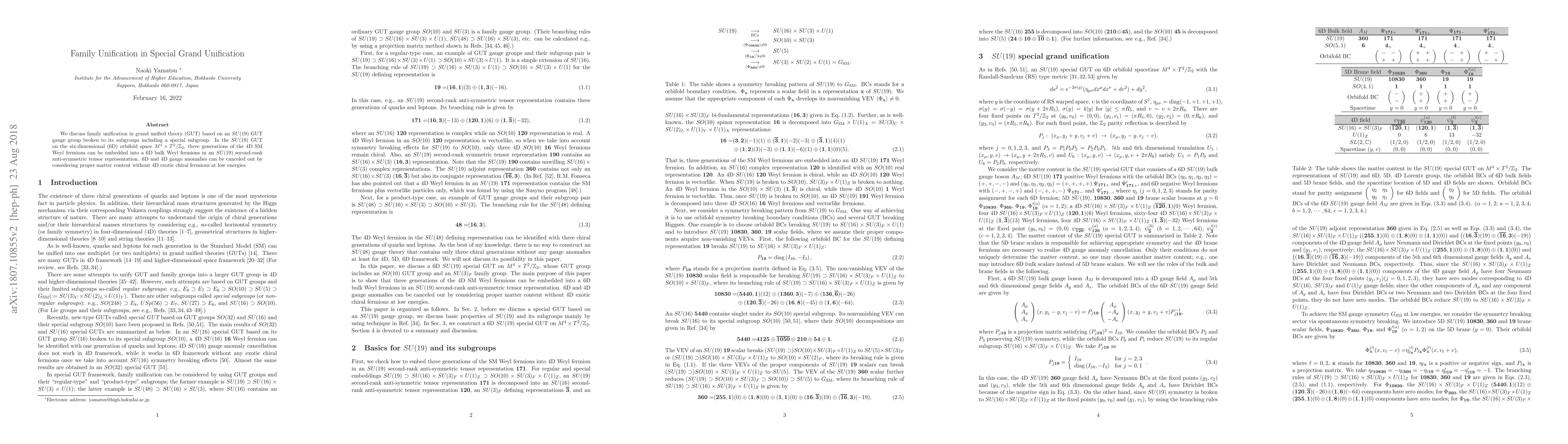 We discuss family unification in grand unified theory (GUT) based on an $SU(19)$ GUT gauge group broken to its subgroups including a special subgroup. In the $SU(19)$ GUT on the six-dimensional (6D) orbifold space $M^4\times T^2/\mathbb{Z}_2$, three generations of the 4D SM Weyl fermions can be embedded into a 6D bulk Weyl fermions in an $SU(19)$ second-rank anti-symmetric tensor representation. 6D and 4D gauge anomalies can be canceled out by considering proper matter content without 4D exotic chiral fermions at low energies.