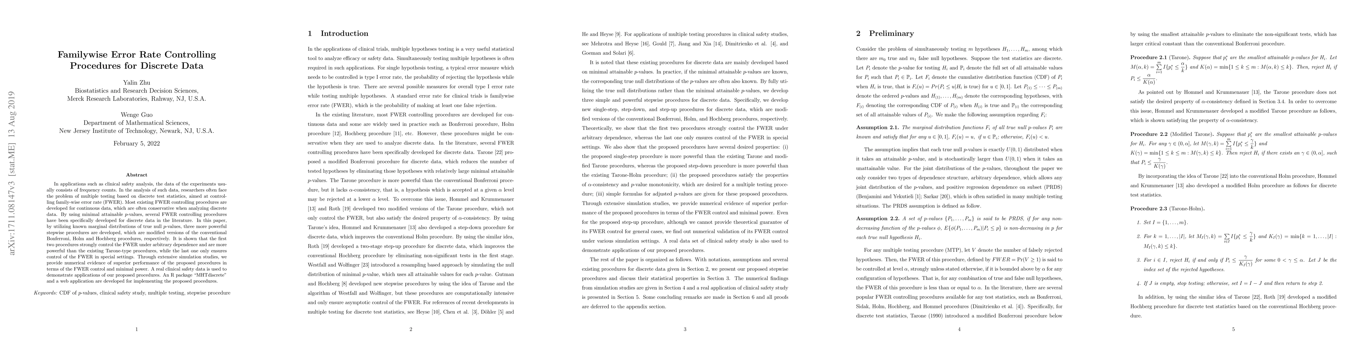 This paper develops three more powerful stepwise procedures for controlling the familywise error rate (FWER) in multiple testing scenarios involving discrete data, modifying the Bonferroni, Holm, and Hochberg methods. The proposed procedures are shown to outperform existing Tarone-type methods through simulations and are demonstrated with a real clinical safety dataset, with an R package and web application developed for implementation.