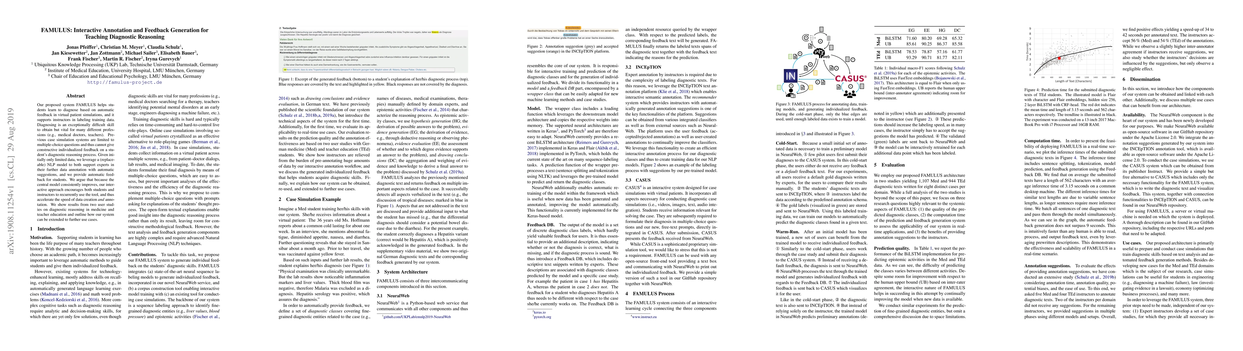FAMULUS is an interactive system that aids students in learning diagnostic reasoning through virtual patient simulations, providing automatic feedback and supporting instructors in annotating training data. The system leverages NLP models to improve both student learning and data creation efficiency through iterative use.