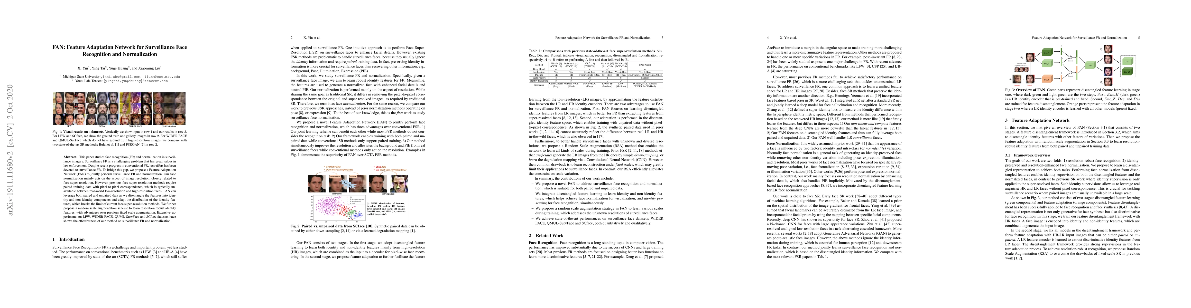 This paper proposes a Feature Adaptation Network (FAN) to enhance face recognition and normalization in surveillance imagery, leveraging both paired and unpaired data to adapt identity features without requiring pixel-to-pixel correspondence. The method also introduces a random scale augmentation scheme for robust identity feature learning, demonstrating effectiveness across multiple datasets.