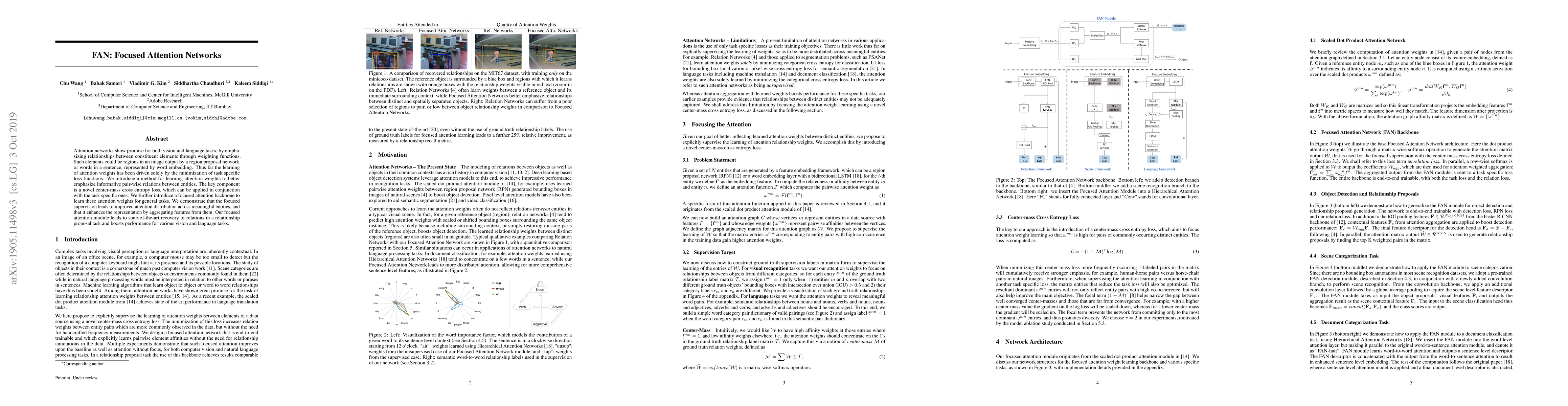 The paper introduces FAN, Focused Attention Networks, which utilize a center-mass cross entropy loss to learn attention weights that emphasize informative pair-wise relations between entities, improving performance across vision and language tasks. The method enhances representation by aggregating features from meaningful entities, leading to state-of-the-art results in relation recovery and various other tasks.