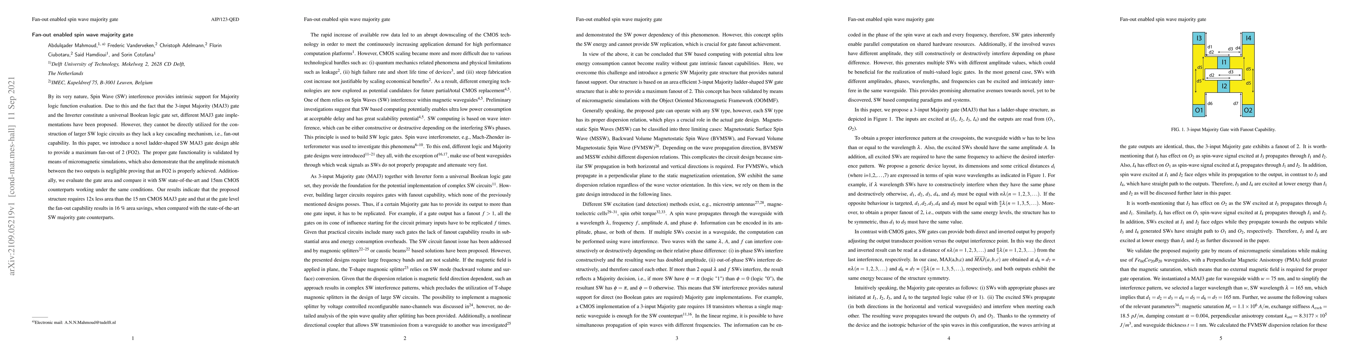 This paper proposes a novel ladder-shaped Spin Wave Majority gate with a fan-out capability of 2, validated through micromagnetic simulations. The design achieves significant area savings compared to both 15nm CMOS and state-of-the-art Spin Wave Majority gates.