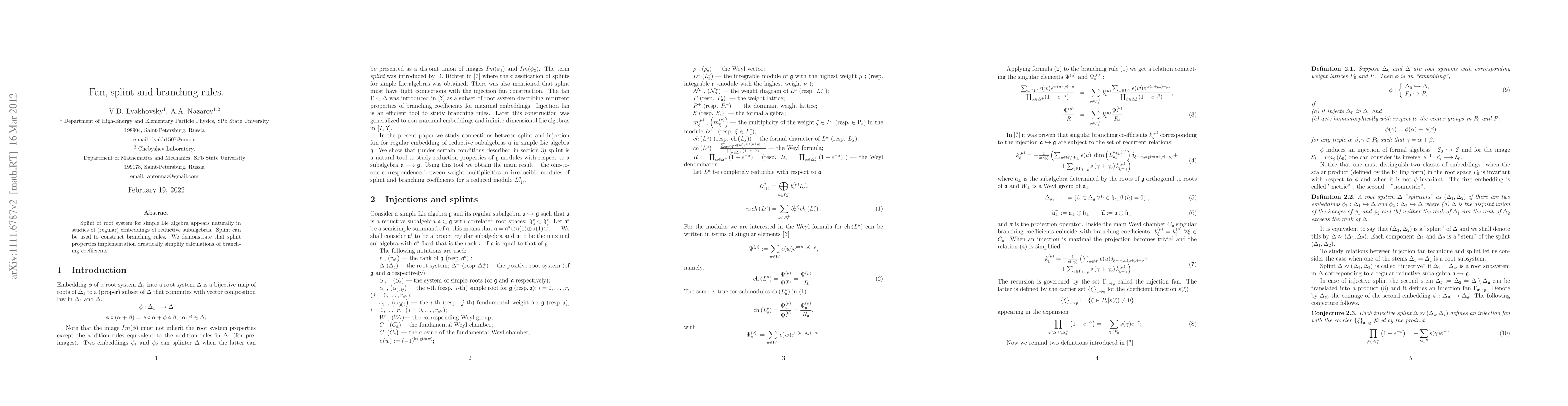 This paper explores the concept of splint in the root system of simple Lie algebras, which aids in the study of embeddings of reductive subalgebras. The authors show that utilizing splint properties significantly simplifies the computation of branching coefficients, thereby streamlining the process of constructing branching rules.
